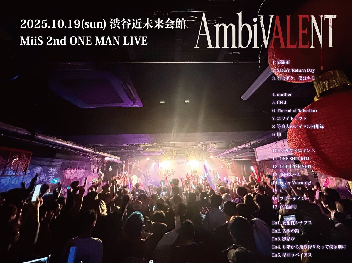 2025.10.19(sun)渋谷近未来会館 MiiS 2nd ONE MAN LIVE 『AmbiVALENT』 非常に沢山の方のご来場、誠にありがとうございました! マンスリー2マンライブ『愛憎劇』とワンマンライブ『AmbiVALENT』は終わりましたが、MiiSは次のステップの為に動き始めます。 これからもよろしくお願いいたします!