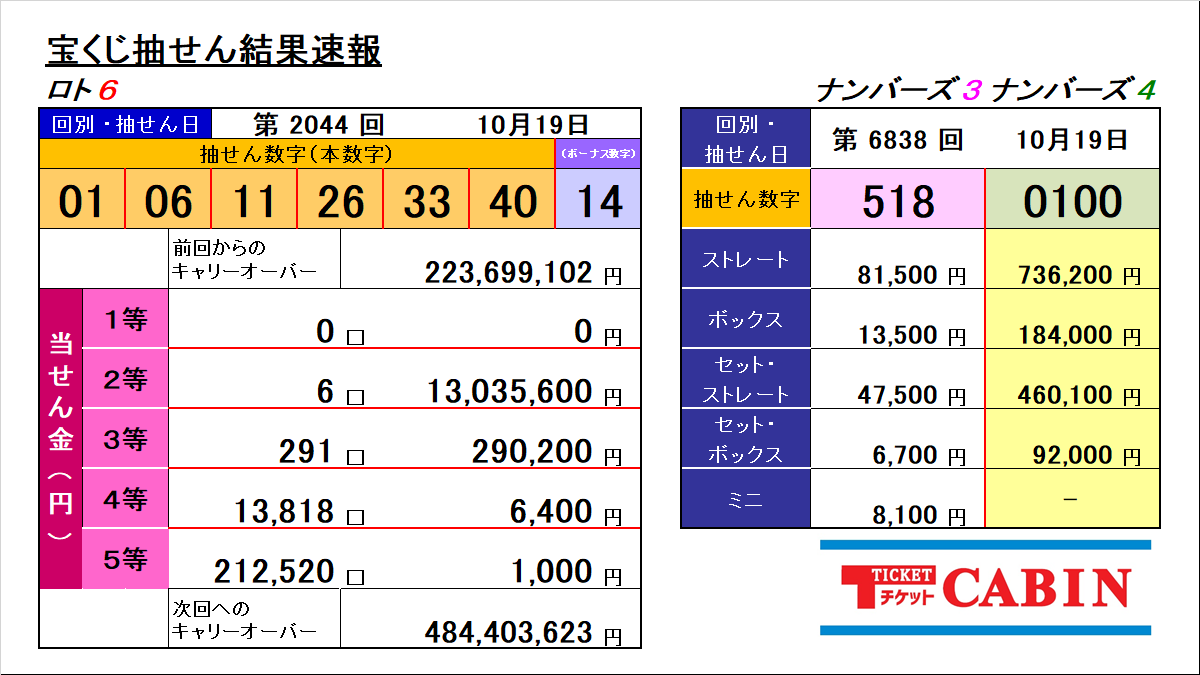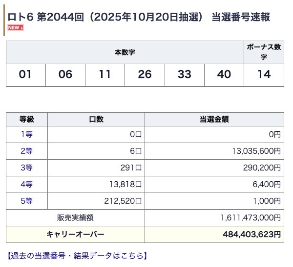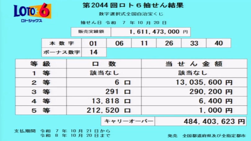 第2044回 #ロト6 抽選結果:01 06 11 26 33 40(14)セット球:C #loto6 #宝くじ #抽選結果