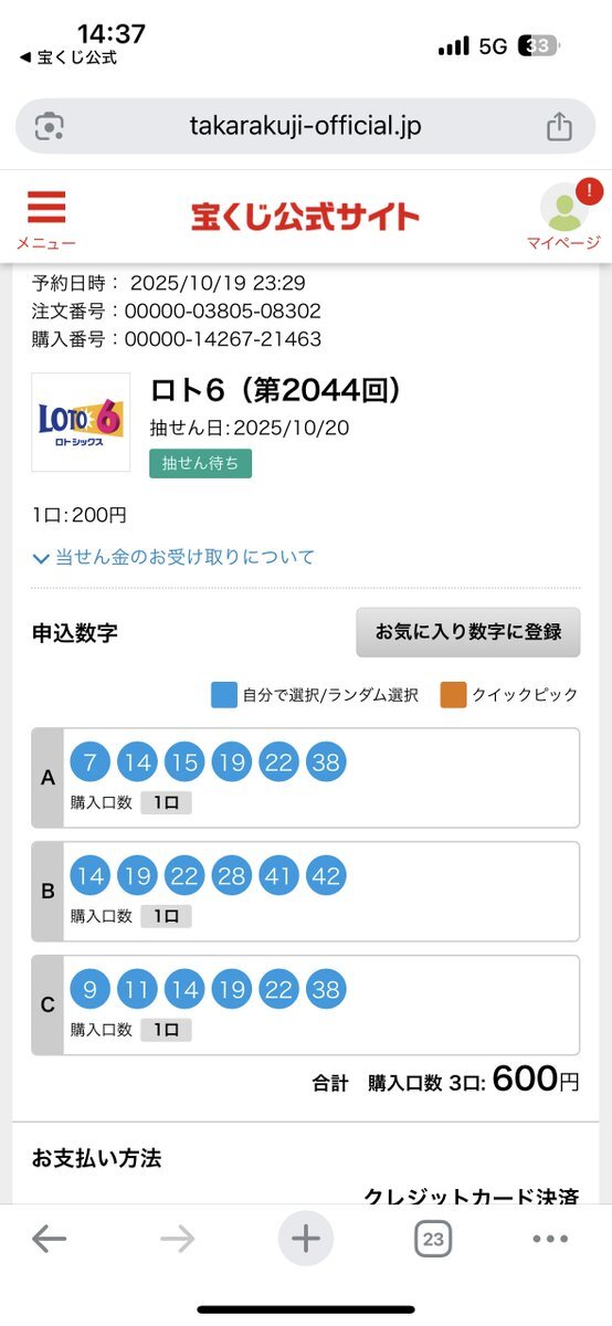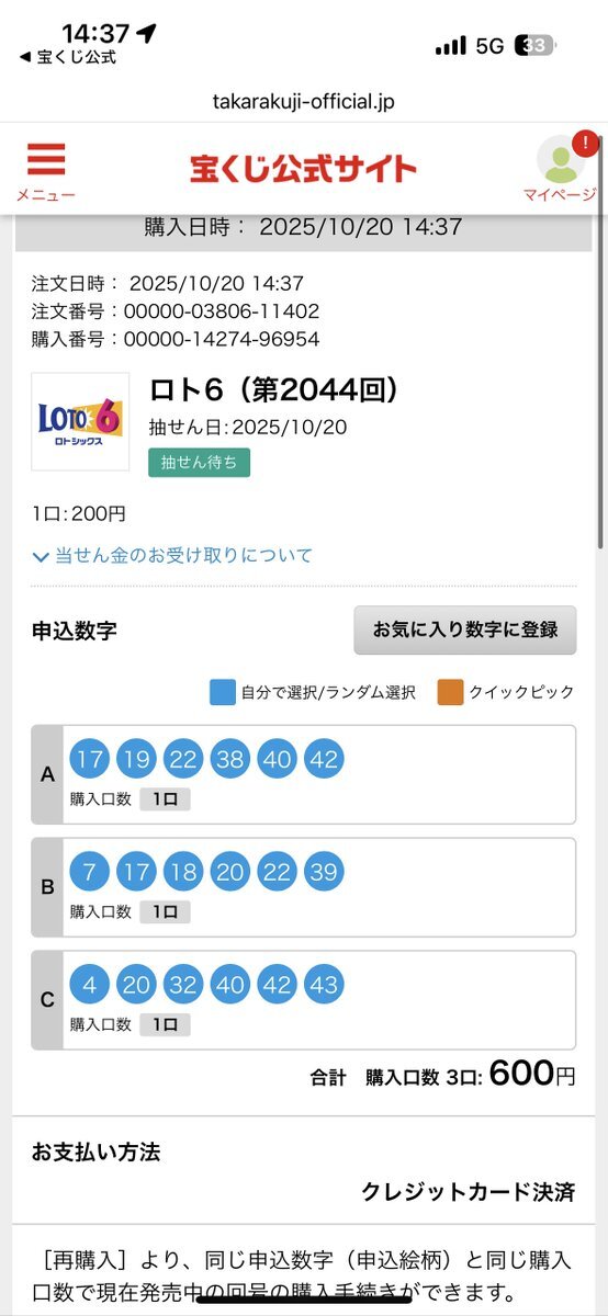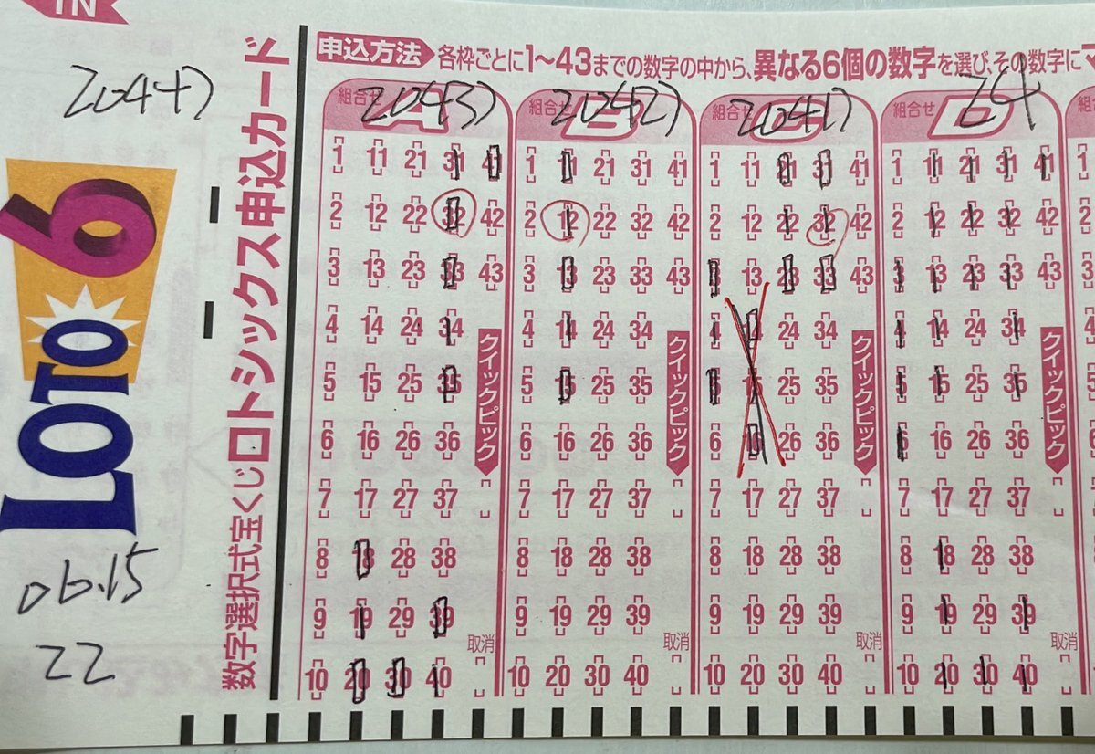 今日はロト6買った😂運にまかせてクイックピックで…金欠病末期だし、当たっても独り占めしないから当たりますように🙏 #無職 #求職活動中 #金欠病 #ロト6