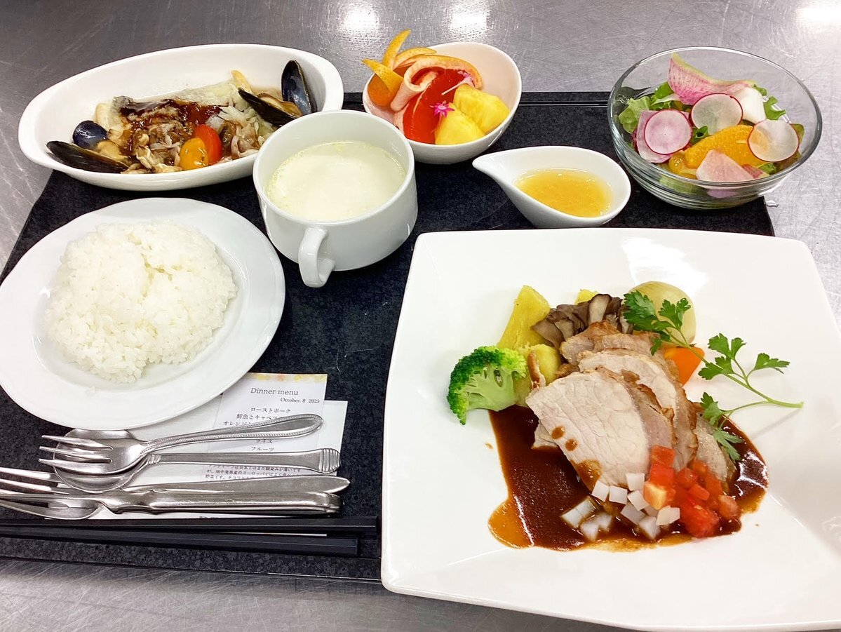 10月8日(水) 🐷夕食🍊 ・ローストポーク ・鮮魚とキャベツのブレゼ ・オレンジと アンディーブのサラダ ・ミルクスープ ・ライス ・フルーツ #ローストポーク #かわぐちレディースクリニック #かわぐちレディースクリニックキッチン #おいしいごはん #からだにやさしいごはん #埼玉県産婦人科 pic.x.com/4HCAfIFdFm