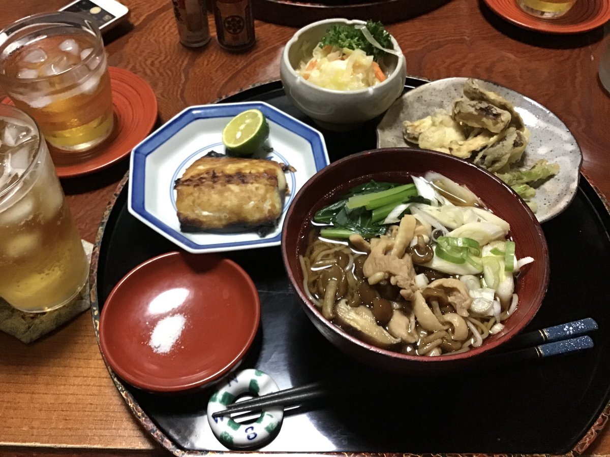 #20250930 #昼食 #だい久製麺 #中華麺 (中) #マルちゃんのラーメンスープ #鶏だししお 残った #ローストポーク #ゆで卵 #メンマ #ほうれん草 #夕食 #天ぷら (椎茸・アスパラガス) #コールスローサラダ #焼き塩鯖 #すだち #鶏きのこ蕎麦 #ニッカ #ドンピエールVSO #ハイボール 美味しかったです pic.x.com/HKbfuhAQvm