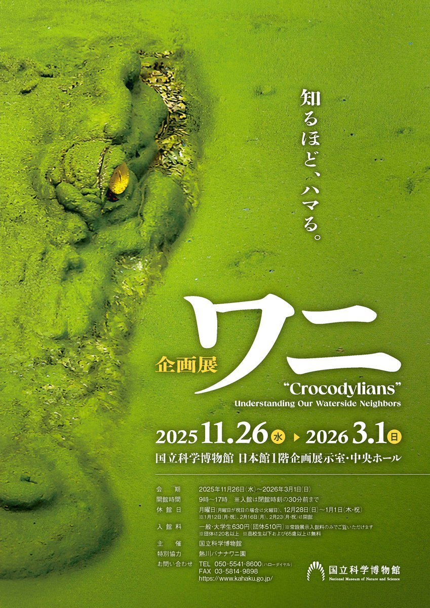 ✣✣––––––––––––––✣✣ ✨🐊開 催 予 告🐊✨ ✣✣––––––––––––––✣✣ 企画展「ワニ」 ◆会期:2025年11月26日(水)~ 2026年3月1日(日) ◆場所:#国立科学博物館 どうぞお楽しみに! kahaku.go.jp/tenji-event/ni…