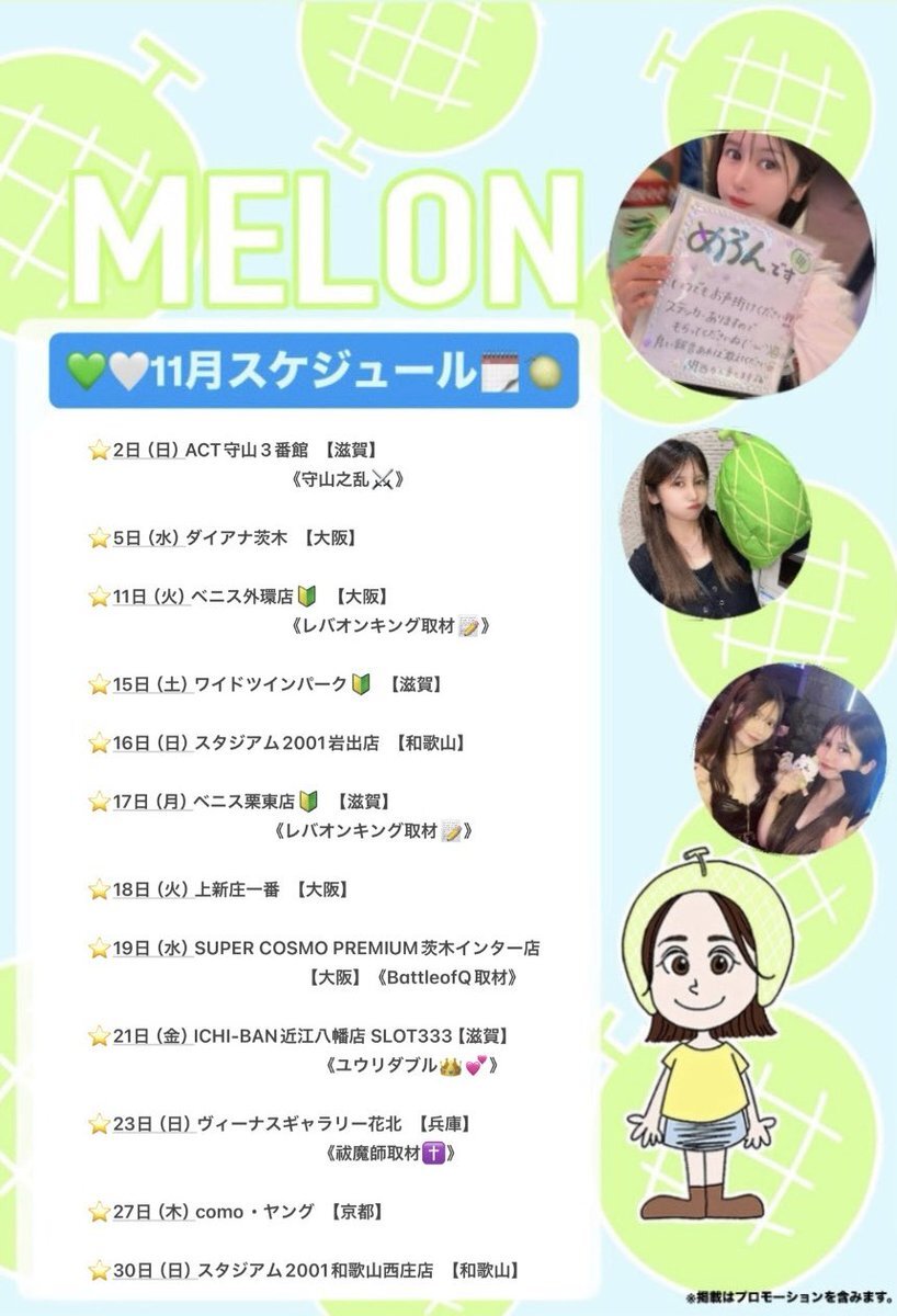 上げ直しすみません。 再度拡散してもらえたら助かります🙇‍♀️ ❥・・ ┈┈┈┈┈┈┈┈┈┈┈┈ ・・❥ 🗓️💚🍈めろん11月スケジュール🤍 ❥・・ ┈┈┈┈┈┈┈┈┈┈┈┈ ・・❥ 《大阪・滋賀・和歌山》などなど 今月も色々な店舗様🏬へお邪魔します☺︎💖 11月も皆様にお会いできる事凄く
