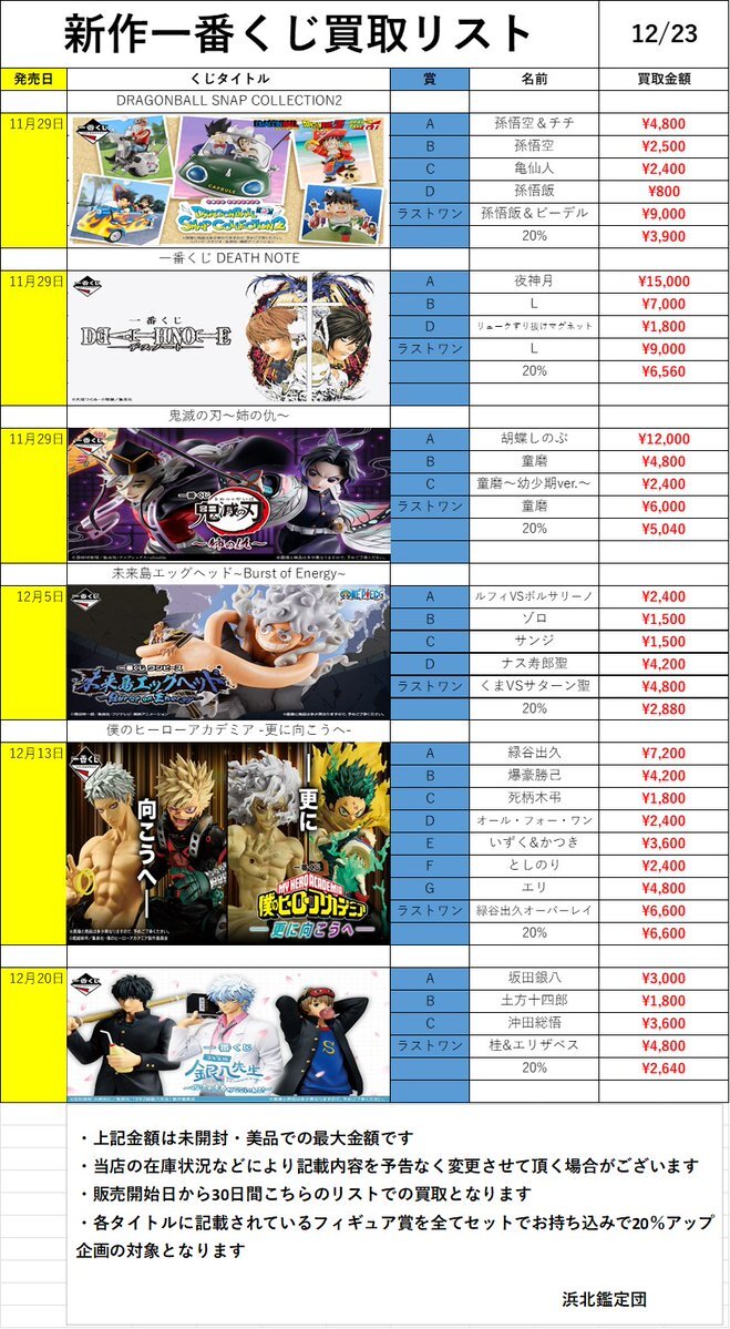 こんばんは!浜北鑑定団玩具部門です! 本日(12/23)更新の新作一番くじ買取リストです! 皆様、どしどしお持ち込み下さい‼️ #浜北鑑定団 #一番くじ #買取 pic.x.com/Fh041sjMLf