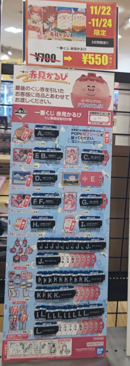 #くじ在庫情報】 🉐セール販売中🉐 #一番くじ #赤見かるび 11/22~11/24 期間限定価格 💥1回、700円 ⇒ 1回、550円💥 ラストワンまであと少し!! この機会にぜひご来店ください🙌✨ #ダイナシティ pic.x.com/LevOeTyUVs