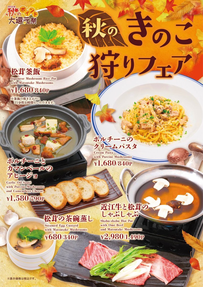 #秋のポイント大還元祭 開催中✨ 注目は秋の味覚きのこ🍄 🍄「秋のきのこ狩りフェア」では 松茸釜飯やポルチーニのクリームパスタなど 香り豊かなきのこ料理が勢ぞろい! 🍽「きのこ料理食べ放題ビュッフェ」も同時開催中! 【近江牛 or 牡蠣】の選べる特別料理付きで満足度◎ #万葉倶楽部 pic.x.com/tLiISGcRjp