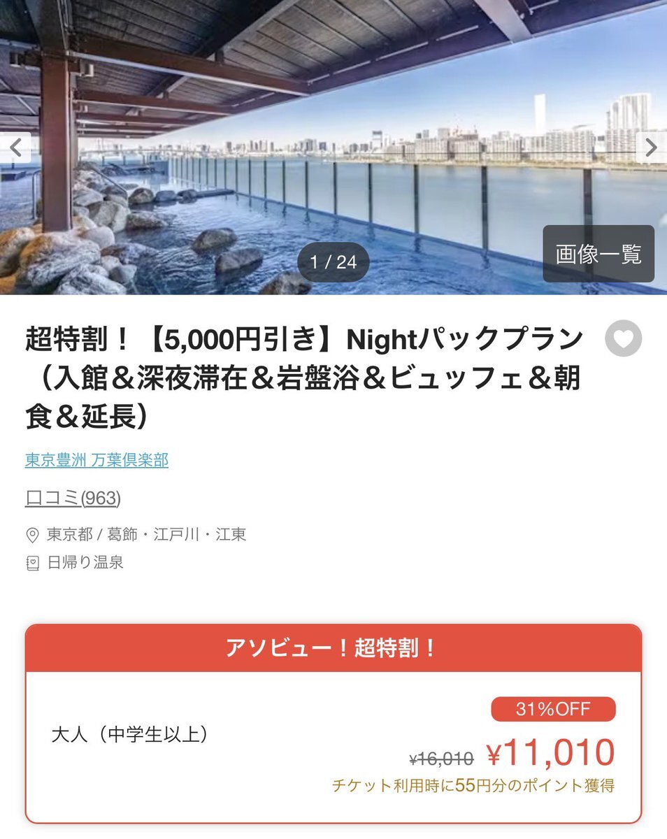 結局ランチを食べないまま到着しました。 今夜のお宿、東京豊洲万葉倶楽部♨️ アソビューで2食+岩盤浴+13時まで延長プラン11010円💰 今夜はお風呂は控えたほうが良さそうなので、岩盤浴でゆっくりするよ☺️ #東京豊洲万葉倶楽部 #万葉倶楽部 pic.x.com/sy5pYfsKZj