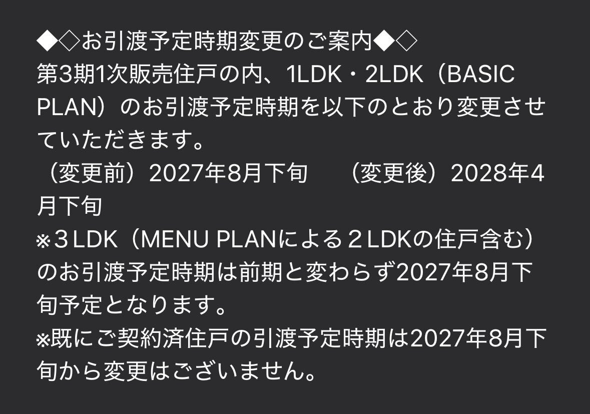 【速報📣】豊海タワー3期1次から「2028年4月下旬の引き渡し」へ!!! 《解説🧑‍🏫》決算の関係上、年度で利益が出過ぎちゃったときにこの調整が行われます。つまり決算良いってことですね🥹 #俺たちの三井不動産 #三井不動産 pic.x.com/C1NmOlb9Kc