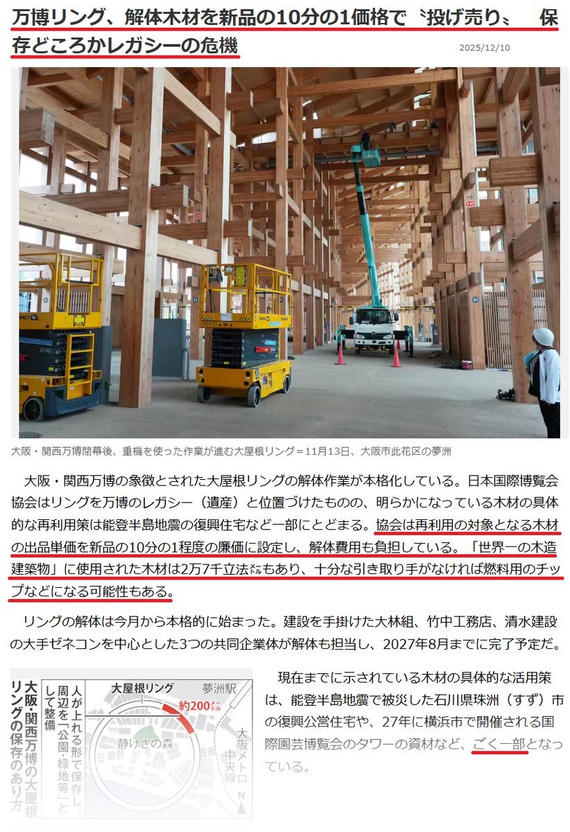 万博リング、解体木材を新品の10分の1価格で〝投げ売り〟 保存どころかレガシーの危機 2025/12/10 sankei.com/article/202512… #地球温暖化 #SDGs #大気汚染 #自然破壊 #明治神宮外苑 #神宮外苑 #樹木伐採反対 #三井不動産 #五輪汚職 pic.x.com/6mX39t1aur