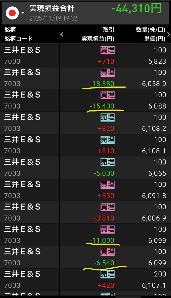 んっ、 買埋でマイナスの4件を合計 -18,380 -15,400 -11,000 -6,540 = 合計 -51,320円 ん、これが無ければプラスだったよ🤣 上昇トレンド中の銘柄への空売りは気をつけましょう! #三井 pic.x.com/nL70xzECGg