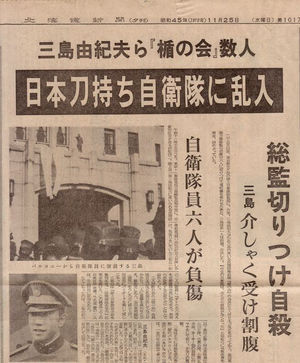 1970年11月25日、市ケ谷駐屯地において、三島由紀夫が憲法改正のため自衛隊の決起を呼びかけた後、割腹自殺しました。 三島が隊長を務める「楯の会」のメンバーも事件に参加したことから「楯の会事件」とも呼ばれます。 国際的に有名な作家でもあった三島の起こした事件に世界中が驚嘆しました。