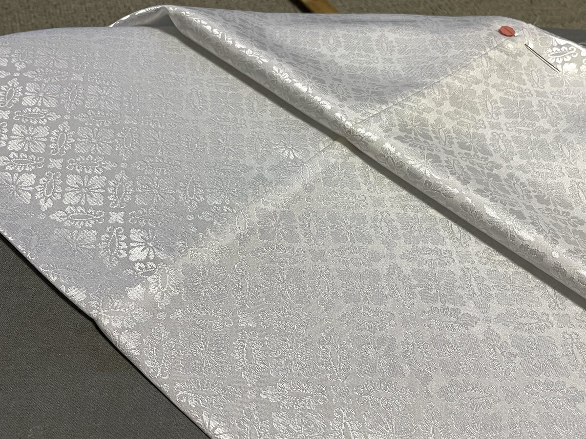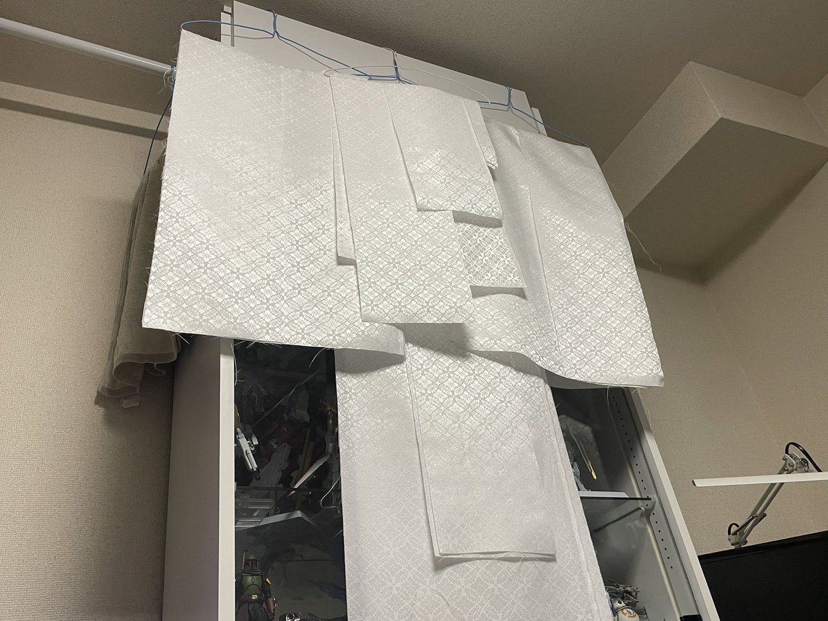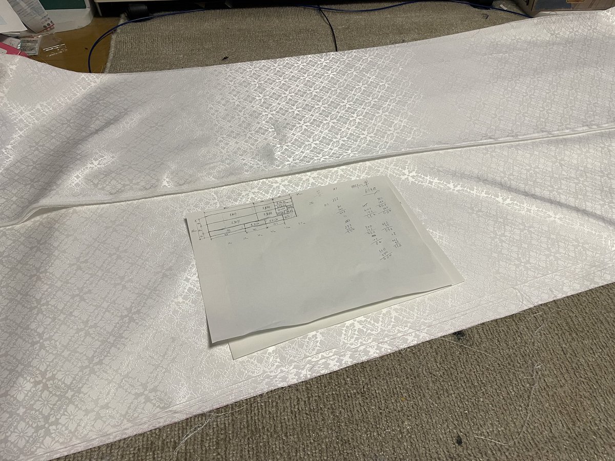 また重い腰を上げて白の長着をパーツごとに切り分けた。 間違えて衿を片側寸法の位置で裁断してもうたけど、左右を真ん中で縫い合わせて上から掛け衿被せれば分からなくなるから問題なしということで。 #和裁 #刀剣乱舞 #三日月宗近 pic.x.com/VDH3Kjq9F6