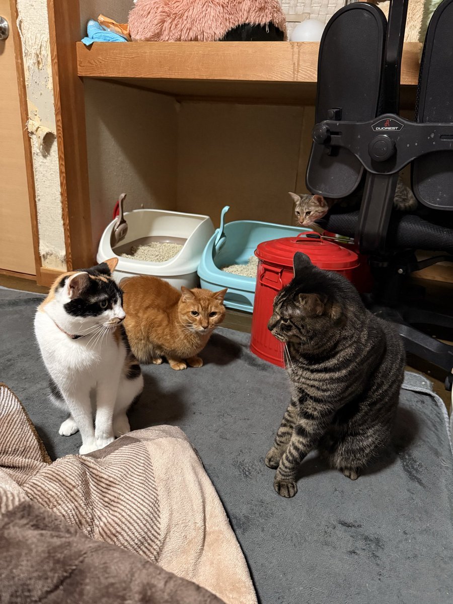 お猫3カ国会議開催中… おや?後ろにまだ出来たてホヤホヤ新興国のチビっ子ちろちゃん王国の皇女ちろる🍫さまが…😸 #猫 #猫好きさんと繋がりたい #保護猫と暮らす #猫のいる幸せ #猫のいる生活 #茶トラ #三毛猫 #キジトラ pic.x.com/qy8QRD9OJg