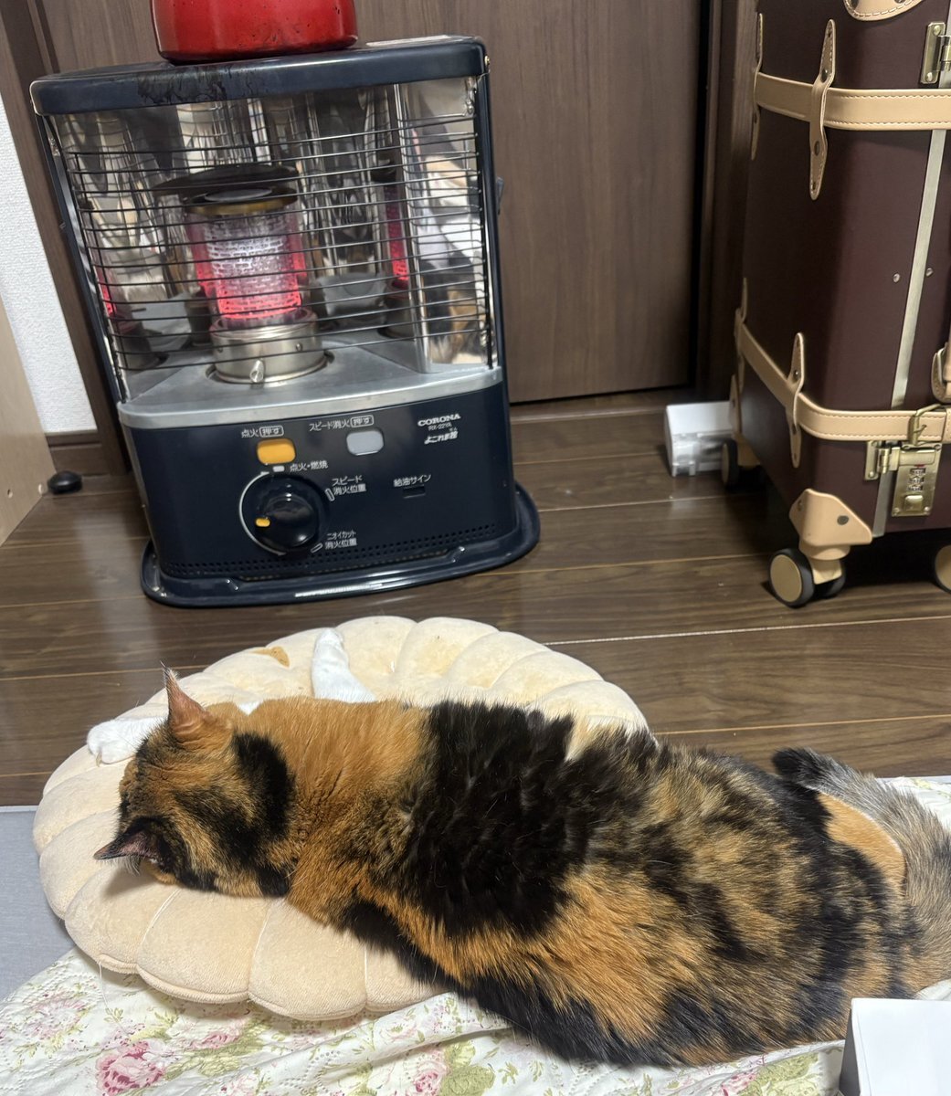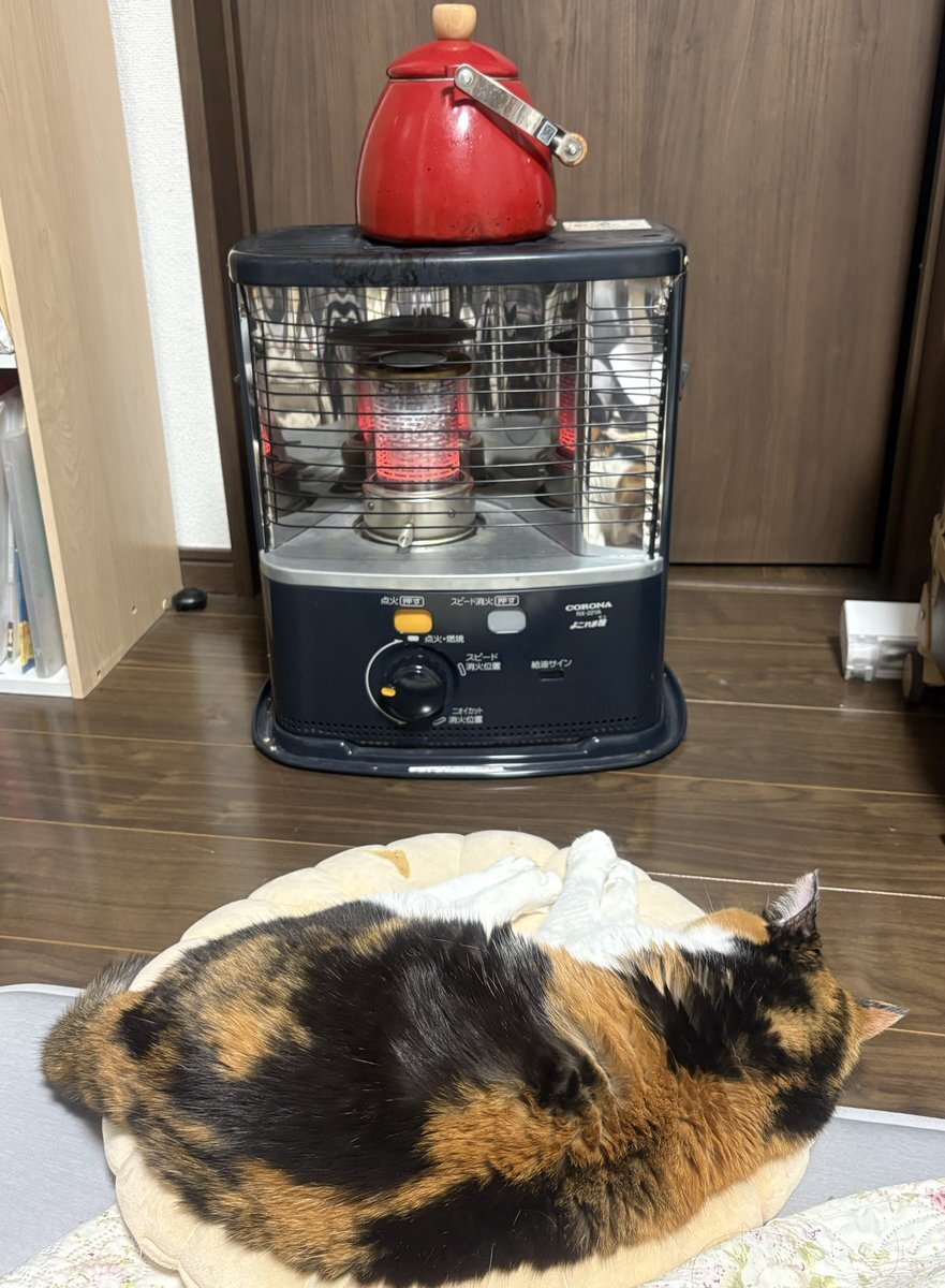 暖房(暖かい空気)は上にいくことを知ってるのね(^o^) フクはミケがいた場所でよく寝てる。鳴きながらその場所に行くの😭 ちびはミケが大好きだったおもちゃを運んで来るの🥹 ミケちゃん あなたが大好きな石油ストーブ出したからね☺️ #天使になった猫 #三毛猫 #猫好きさんと繋がりたい #腎不全 pic.x.com/BsyvGZTCll