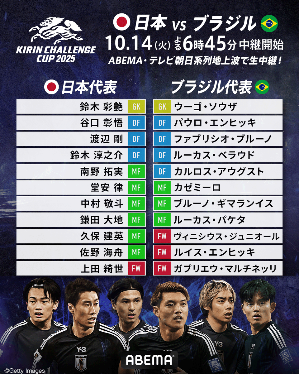 / サッカー日本代表 vs ブラジル代表 まもなくキックオフ⚽️ ▶︎ abema.go.link/jVA34 \ 両チームのスタメンは画像をチェック! [日本代表] パラグアイ戦では出場のなかった 久保建英がスタメンに名を連ねる! [ブラジル代表] 豪華メンバーが集結! ヴィニシウスやカゼミーロが登場!