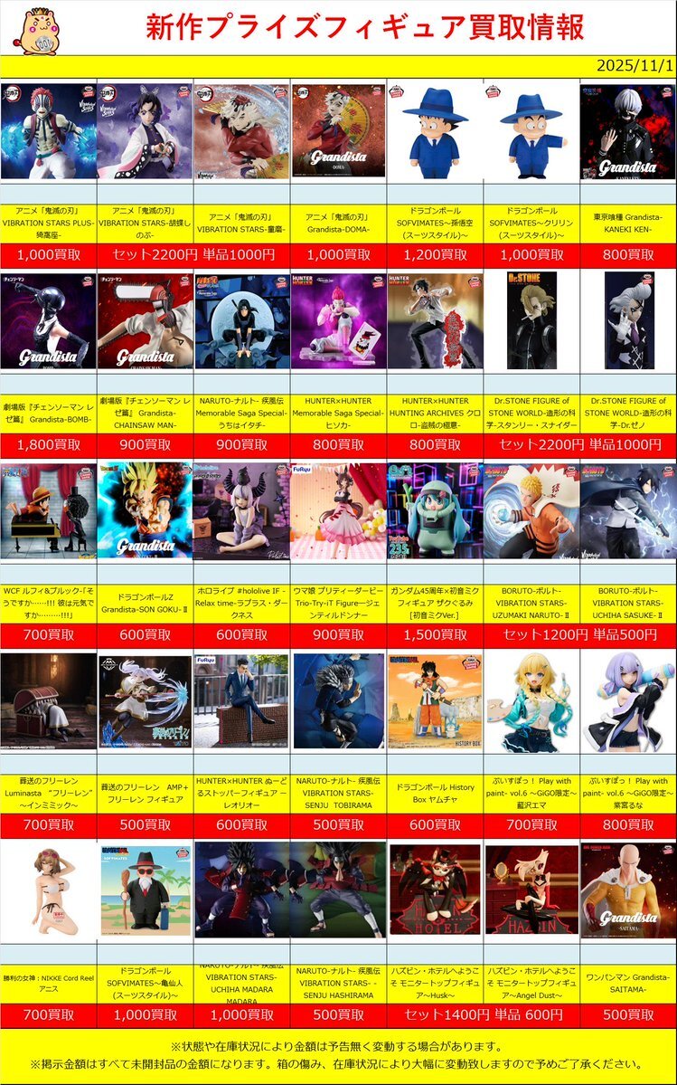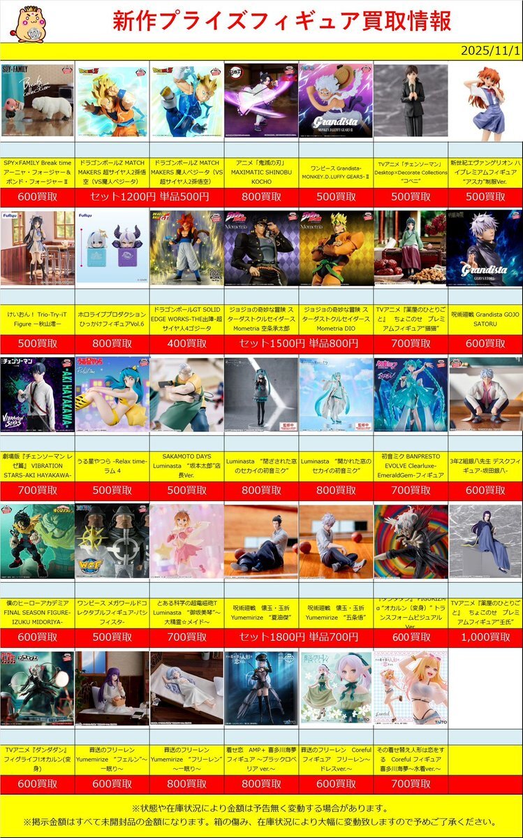 ‼️⭐️9~10月 新作プライズ 買取情報⭐️‼️ ❤️‍🔥#フィギュア どんどん買取りしてます❤️‍🔥 🔆🔆🔆🔆🔆🔆🔆🔆🔆 #ボム Grandista ¥1,800🔺 #レゼ #童磨 Grandista ¥1,000 #孫悟空 ¥1,200 #壬氏 ¥1,000🔺 #金木研 ¥800 🔆🔆🔆🔆🔆🔆🔆🔆🔆 🌀🌀ぜひ、#ぐるぐる大帝国 #三郷 店へ🌀🌀 #草加 #足立 pic.x.com/nY9P0IhTSM