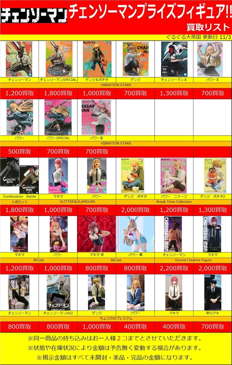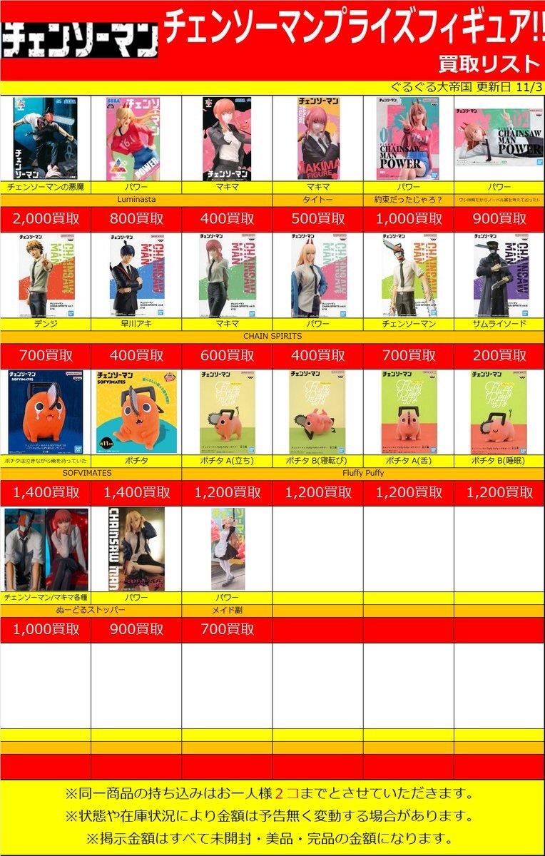 💣新着 #チェンソーマン プライズ 買取情報💣 11/7 ❤️‍🔥#プライズフィギュア 絶賛買取中❤️‍🔥 🔆🔆🔆🔆🔆🔆 💘#パワー メイド服 ¥700🆕 💘#マキマ CHAIN ¥600🔺 💘#ポチタ 金額🆙中💰 💘#GG パワー ¥700🔺 🔆🔆🔆🔆🔆🔆 強化買取中🐭😘 🌀🌀#ぐるぐる大帝国 #三郷 店へ🌀🌀 #松戸 #葛飾 pic.x.com/NDRfFQ2C9z