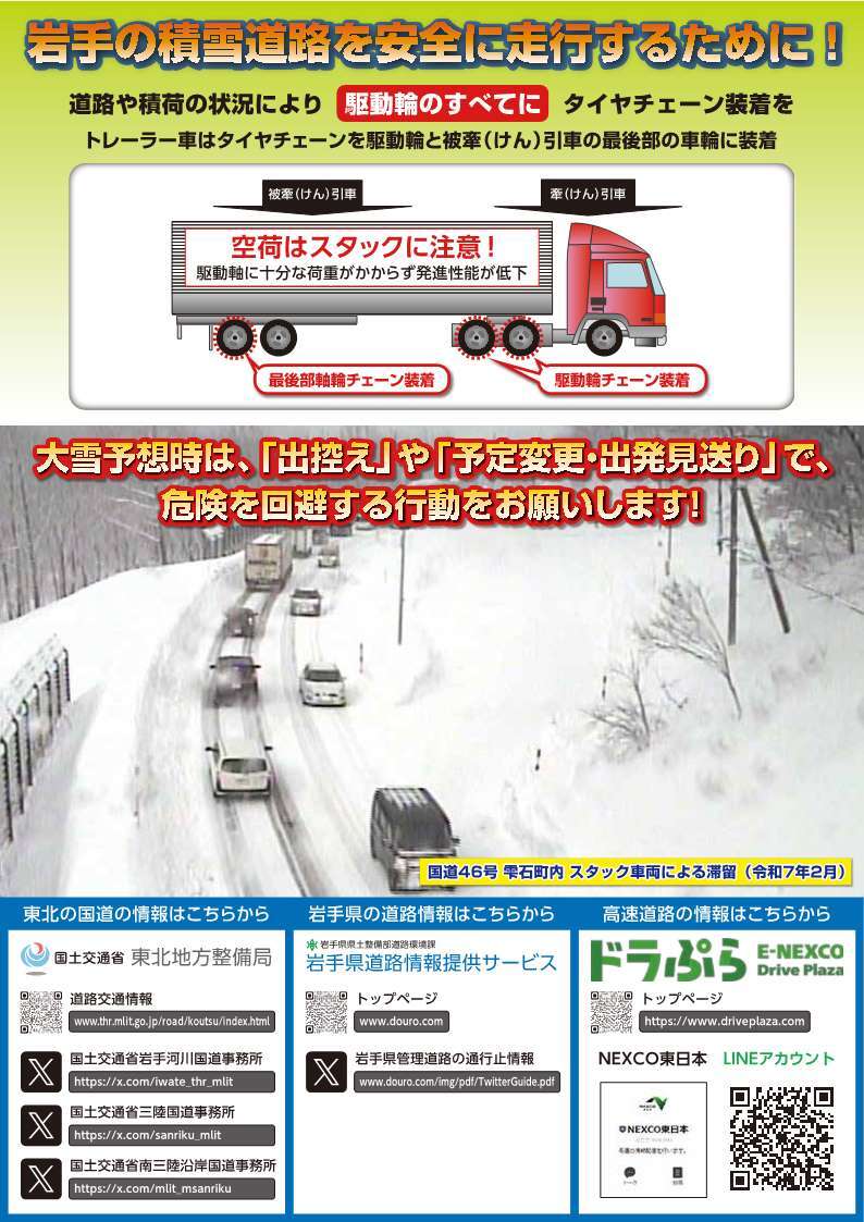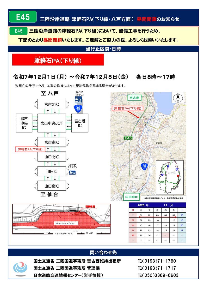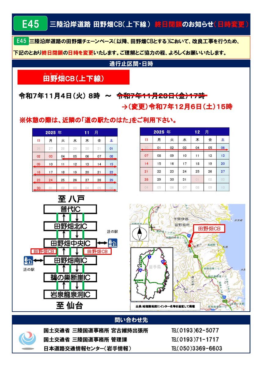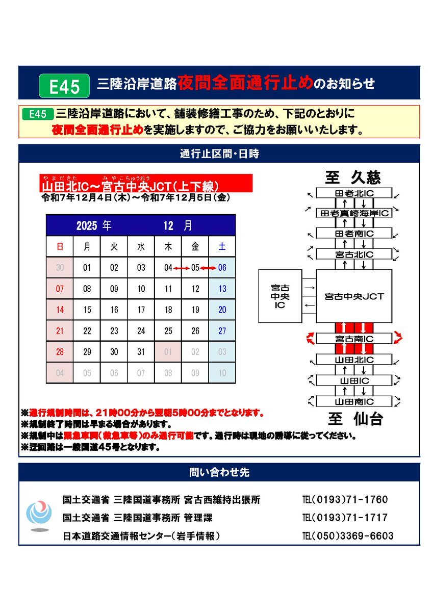 #道路情報 #通行規制 #釜石道 #三陸道 場所:E45 三陸道 大船渡碁石海岸IC~山田南IC E46 釜石道 釜石仙人峠IC~釜石JCT 日時:12/1~12/4、12/15~12/23、1/6~1/9 21:00~翌6:00 内容:トンネル点検のため ※緊急車両の通行は、現地の交通誘導員の指示に従ってください。 #南三陸沿岸国道事務所