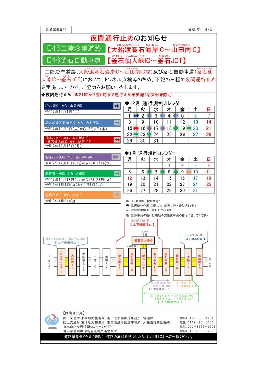 大船渡碁石海岸IC 〜大船渡IC 令和7年12月2日(火)から12月4日(木) 夜間通行止め #三陸道 #大船渡 x.com/mlit_msanriku/…