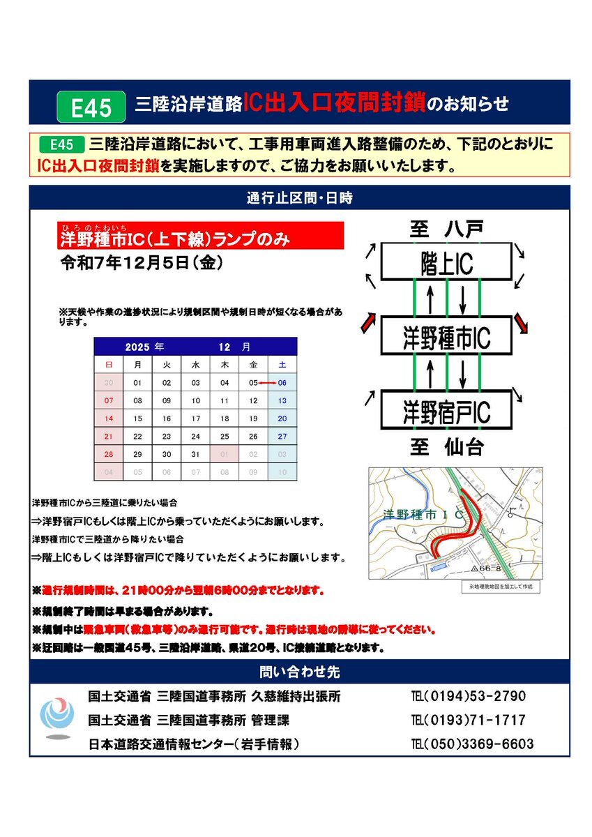 【 #IC出入口夜間封鎖 情報】 ■場 所:#三陸道 洋野種市ICランプ(上下線) ■日 時:12月5日(金)21:00~翌6:00 ■迂回路:別添「迂回路について」をご確認ください。 規制の詳細はチラシをご覧ください。 ご理解とご協力をお願いいたします。 pic.x.com/axjkrNbuSy
