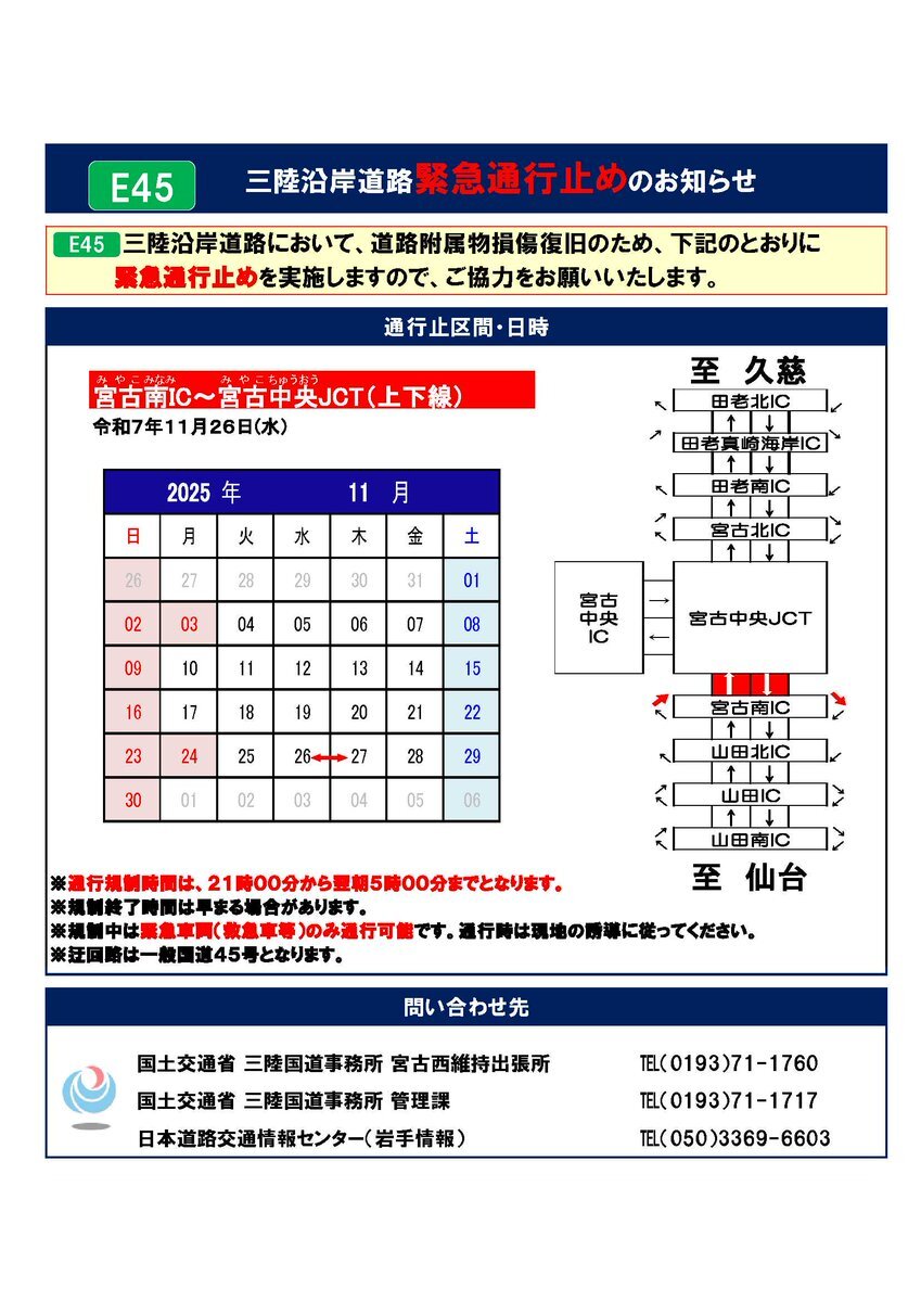 #三陸道 宮古市内で緊急工事 一部通行止め #tc_highway #通行止 #岩手県道路情報 三陸国道事務所などによると、岩手県宮古市の三陸沿岸道路で緊急工事のため、11月26日21:00から、上下線の宮古南IC=宮古中央JCT間で通行止めとなっています。 news.jp/i/136630966936…