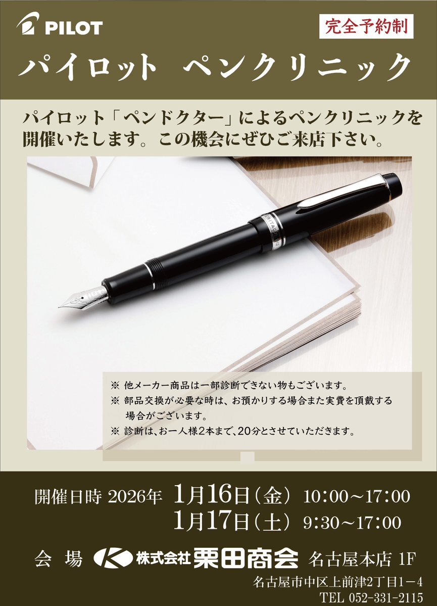 【完全予約制】 1/16(金)10:00~17:00 1/17(土)9:30~17:00 上記期間でペンクリニックを開催いたします✨ ご予約方法はお電話もしくは店頭にてお願い致します 皆様のご来店お待ちしております! ※完全予約制の為予約なしでの診断は受け付けておりません。 #栗田商会 #ペンクリニック #上前津 pic.x.com/LZWtasxTXw