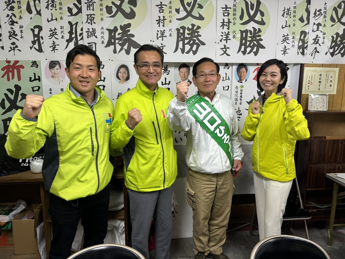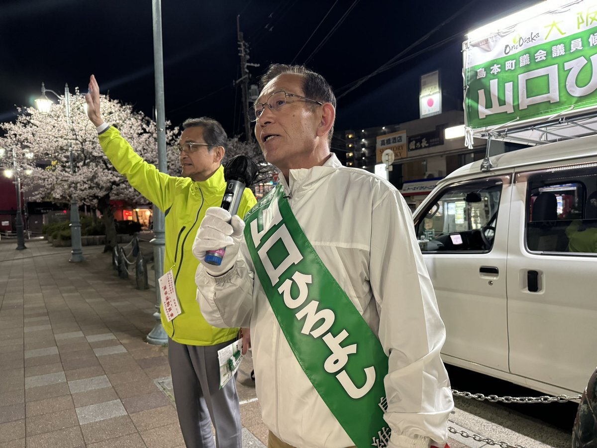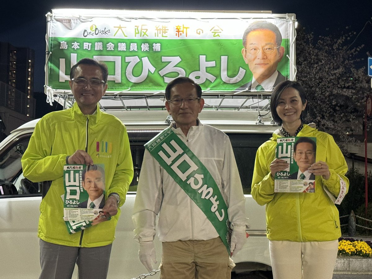 #島本町議選挙🍀#山口ひろよし 候補】 〝ながーーーいお付き合い〟で知られる銀行でバンカーをしていた山口候補✌️金融のプロの視点で町政に貢献してきたベテランです✨ 維新議員団のリーダーが挑む4期目の戦いを皆さまの1票でお支えください🙏 #大阪維新の会 #上島一彦 元箕面市長も一緒😆 pic.x.com/W7QrWrdXe1