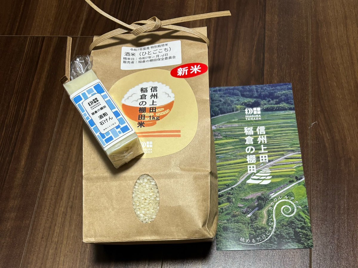 信州上田稲倉の棚田で収穫された酒米ひとごこちを物産販売会で購入 食用米としても美味しいとのこと 岡崎酒造さんの酒粕を使用した石けん付きでした ぐんま名月と美味だれもGET #上田市 #岡崎酒造 #練馬区 pic.x.com/xBg60bDW16
