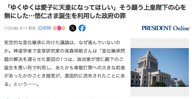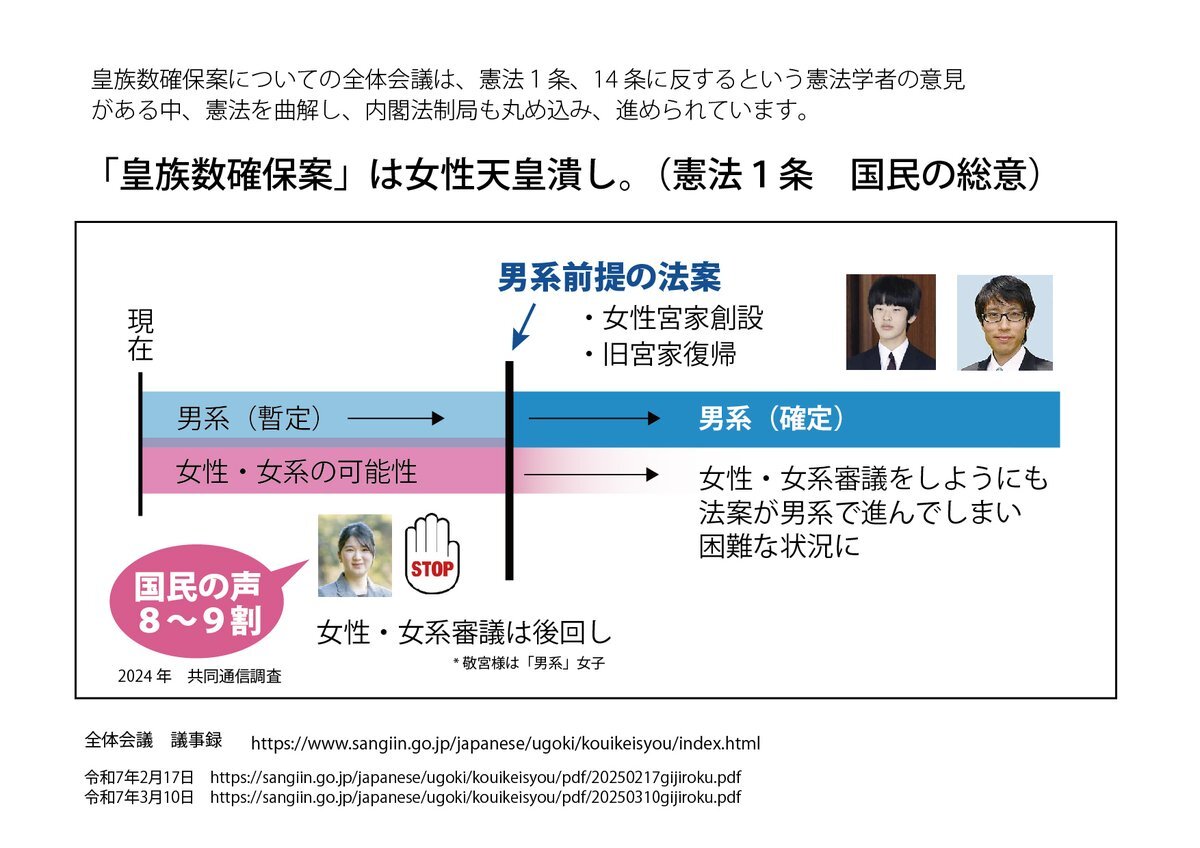上皇様と国民9割の声を無視する政府の皇族数確保案、政府の姑息な法案。 天皇の子が天皇。 男系である敬宮さまの継承から議論し直すべき。 小泉政権時に保留となっている女性天皇法案を見直すべきです。 #上皇陛下 #敬宮様を皇太子に #Yahooニュース news.yahoo.co.jp/articles/6655f… pic.x.com/ntKVjXZ74Z
