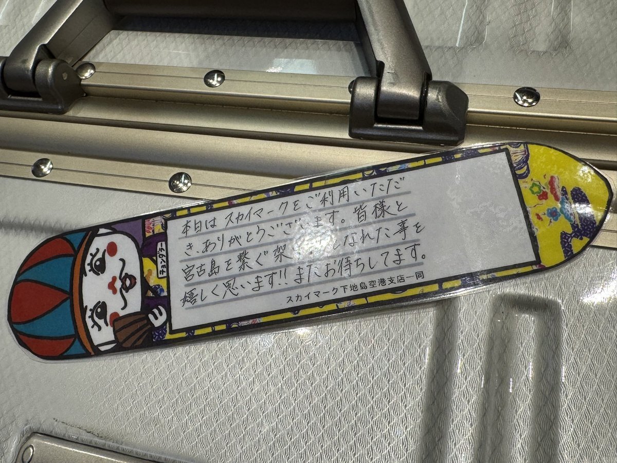荷物のタグ初めてでびっくり! 3種類くらいありました! 大手には出来ない事ですかね! 下地島空港、スカイマークさんありがとうございました! みなさんも宮古島に行く時は是非検討してみて下さい また年末♪ #スカイマーク #下地島 #宮古島 pic.x.com/yoqYbGxL5C