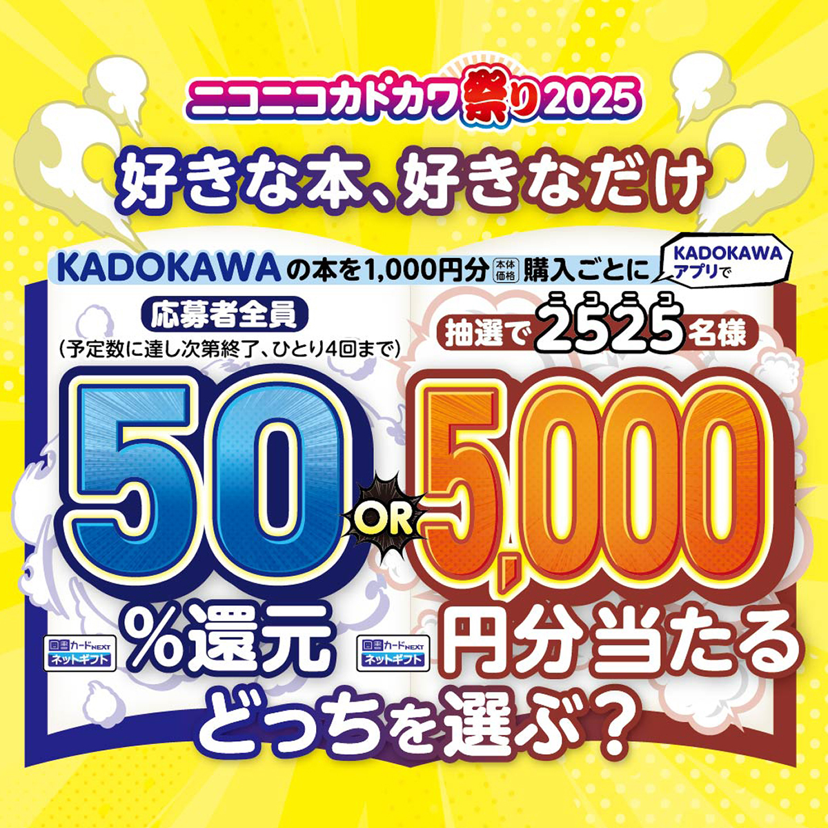 ニコニコカドカワ祭り2025 9/26(金)~10/19(日) KADOKAWAの本を1,000円分購入ごとに KADOKAWAアプリで ★★★★★★★★★★★★★ 図書カードNEXTネットギフトが 応募者全員:50%還元 or 抽選で2525名様:5,000円分当たる! ★★★★★★★★★★★★★ 詳細は👇 promo.kadokawa.co.jp/campaign/nicok…