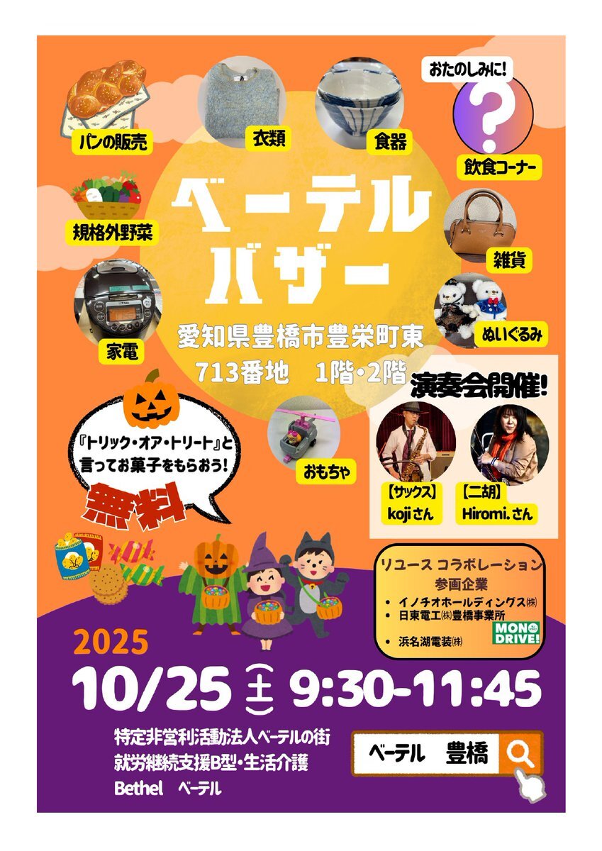 2025/10 今月のバザーのお知らせです😊 『 #トリックオアトリート 』でお菓子プレゼント🎃 当日は是非マイバッグご持参のうえ、皆様のお越しをお待ちしております👜 #豊橋 #豊橋市 #バザー #リユース #リサイクル #野菜 #パン #SDGs #10月 #不要品 #不用品 #不用品回収 #ハロウィン #ハロウィーン pic.x.com/6imXpw7puA