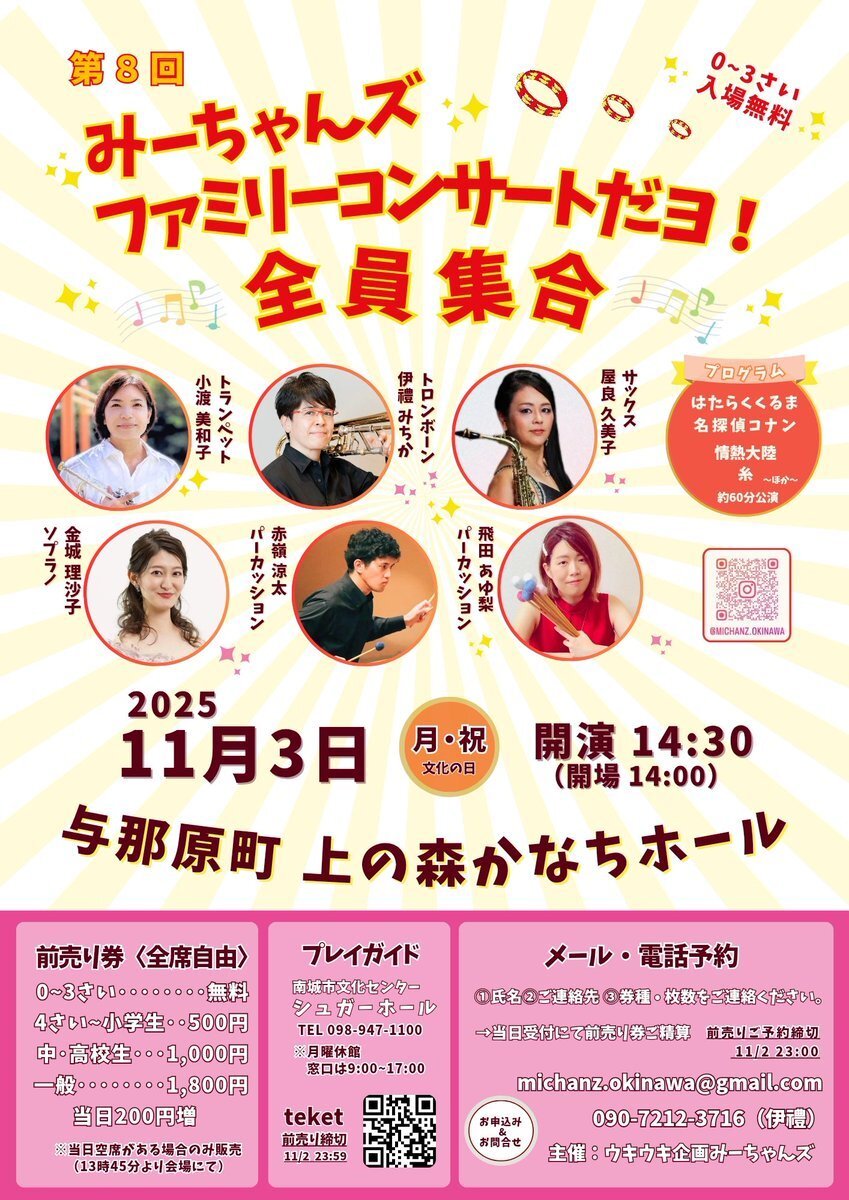 みーちゃんズ ファミリーコンサート 2025年11月3日(月祝) 開演14:30 (開場14:00) 与那原町 上の森かなちホール 0〜3さいは無料です! 赤ちゃんからおじぃちゃんおばぁちゃんまで、一緒に生演奏で楽しみましょう! #与那原 #東浜 #南城市 #沖縄 #おひとり様も大歓迎 instagram.com/michanz.okinaw… pic.x.com/1Mg2gdX1uc