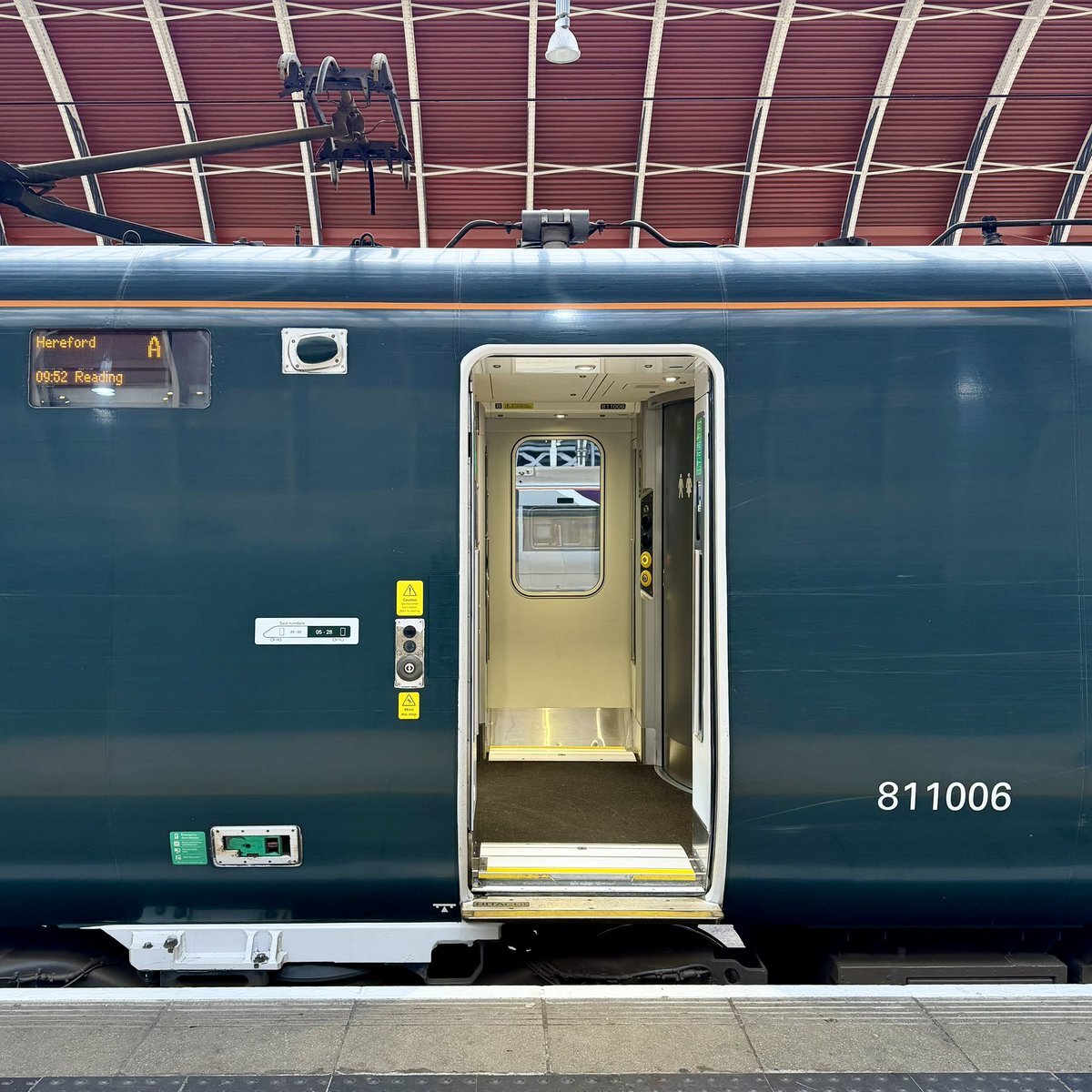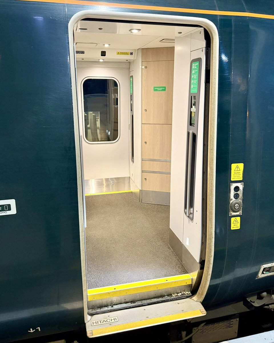 世界一周中:ロンドンとオックスフォードの往復は日立製作所の英国工場(Hitachi Rail)で製造されたClass800系で。車内ではなく、何故か乗降タラップにHitachiのロゴが… #世界一周 #aroundtheworld #Oxford #UK pic.x.com/XnKFQiZSzb