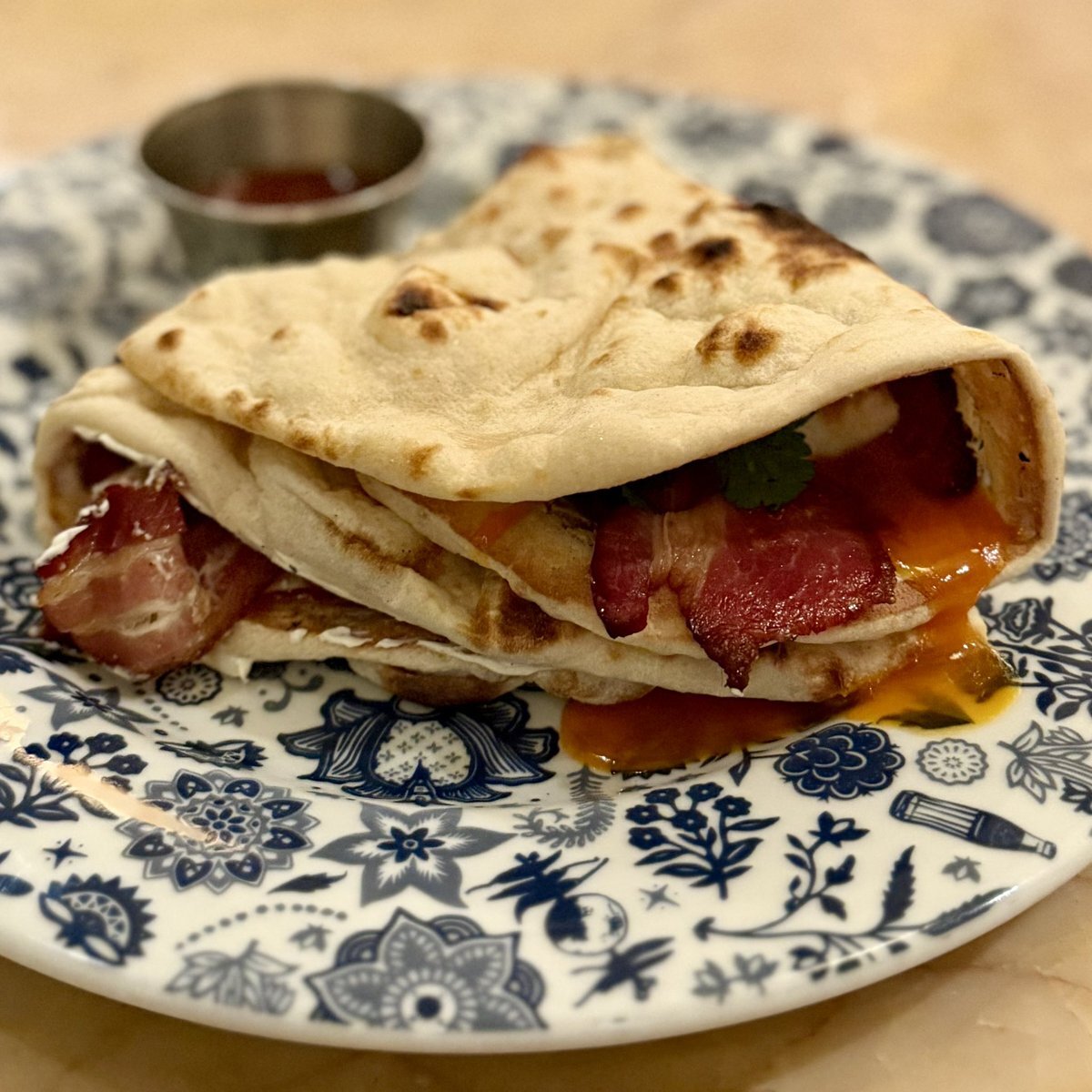 世界一周中:今朝の朝食もDishoomで。Bacon & Egg Naan Rollにしました。 #世界一周 #aroundtheworld #London #UK #Dishoom pic.x.com/DdTHVU93Zd
