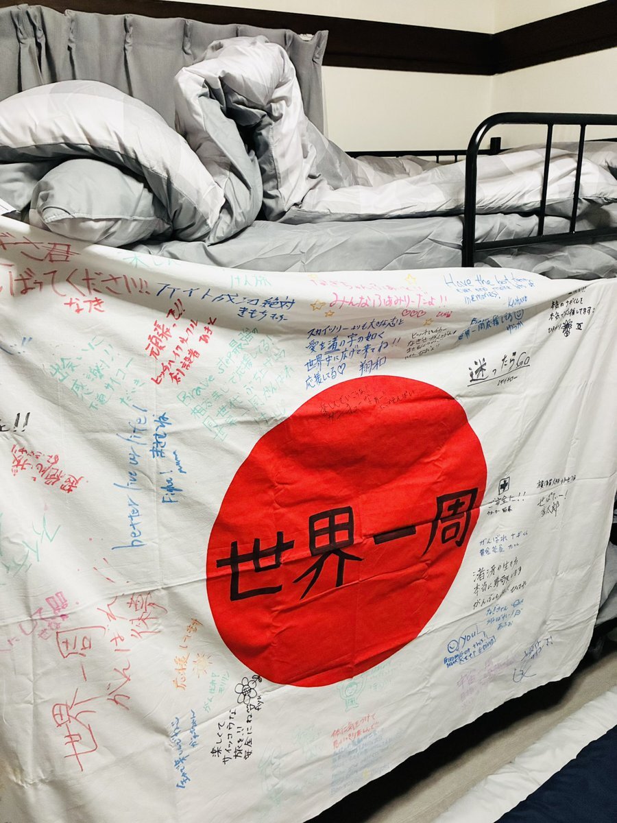これから世界一周に挑戦する住民の応援旗🚩 本当に尊敬できます🫡 個性豊かでユニークな住民も大募集です! 大学や専門学校も近く学生さんも是非! 光熱費無料、米、パスタ食べ放題です🍝 #世界一周 #大学生 #シェアハウス #リバ邸 #住民募集中
