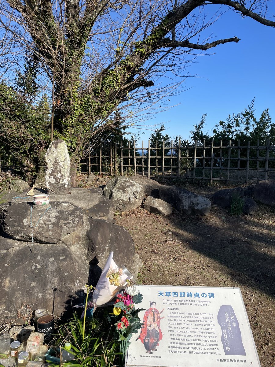 世界文化遺産 原城跡🏯 女子供も一人残らず悲劇的な最期を遂げた島原の乱の舞台。昔訪れた時より明るくきれいになっている、ボタン押すと😱説明が流れる案内板もなかった。誰もいない城跡、天草四郎時貞像が哀しい歴史を彷彿させる。最後の写真は海岸から見上げた原城跡