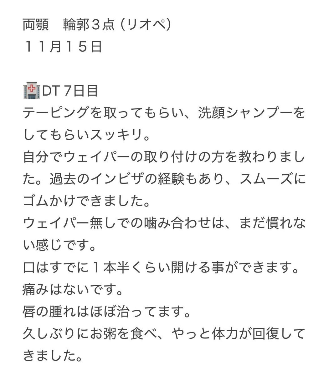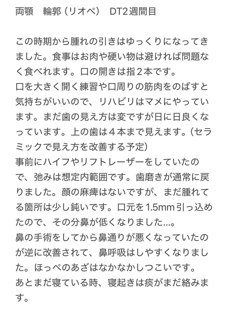 なんか今朝急に口回りの浮腫がガクッと一段階落ち着いた。 昨日まで2.5cmだった開口も今日矯正歯科の検診で3.4cm❗😲 そりゃあんだけ腫れてたから、人より遅いよね~💦 今見ても笑えるくらい腫れてるw これ誰? #両顎手術 #DT2ヶ月 写真は術後2日目、3日目、10日目くらい pic.x.com/Bw3nsP7g7N