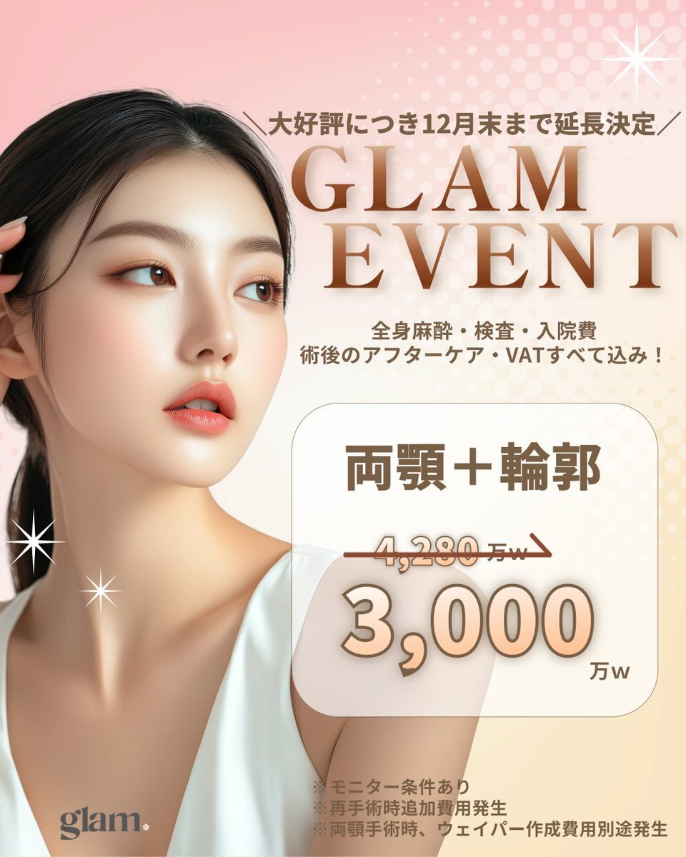 🌼GLAM整形外科🌼 \大好評につき12月末まで延長決定!!/ 👑 両顎+輪郭セット 通常価格 4,280万w ➡️ 特別価格 3,000万w まずはカウンセリングだけでもOK✨ お気軽にお問い合わせください! ✦ lin.ee/F326NYe #両顎手術 #輪郭整形 #輪郭手術 #韓国整形 #韓国美容 pic.x.com/5OXR2gQvqE