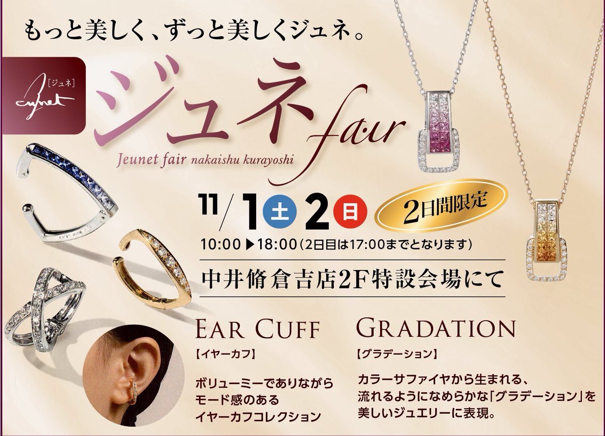 #中井脩倉吉店 では11/1(土)-2(日)の両日「ジュネコレクション2025」を開催。これからの季節を華やかに彩る美しい #ジュエリー の数々をお楽しみください。人気の #イヤーカフ も多数ご用意しています。 #ゴールド #プラチナ #サファイア #ダイヤ #リング #ネックレス #イヤーカフピアス #中井脩倉吉店 pic.x.com/1Br0aF7GY7