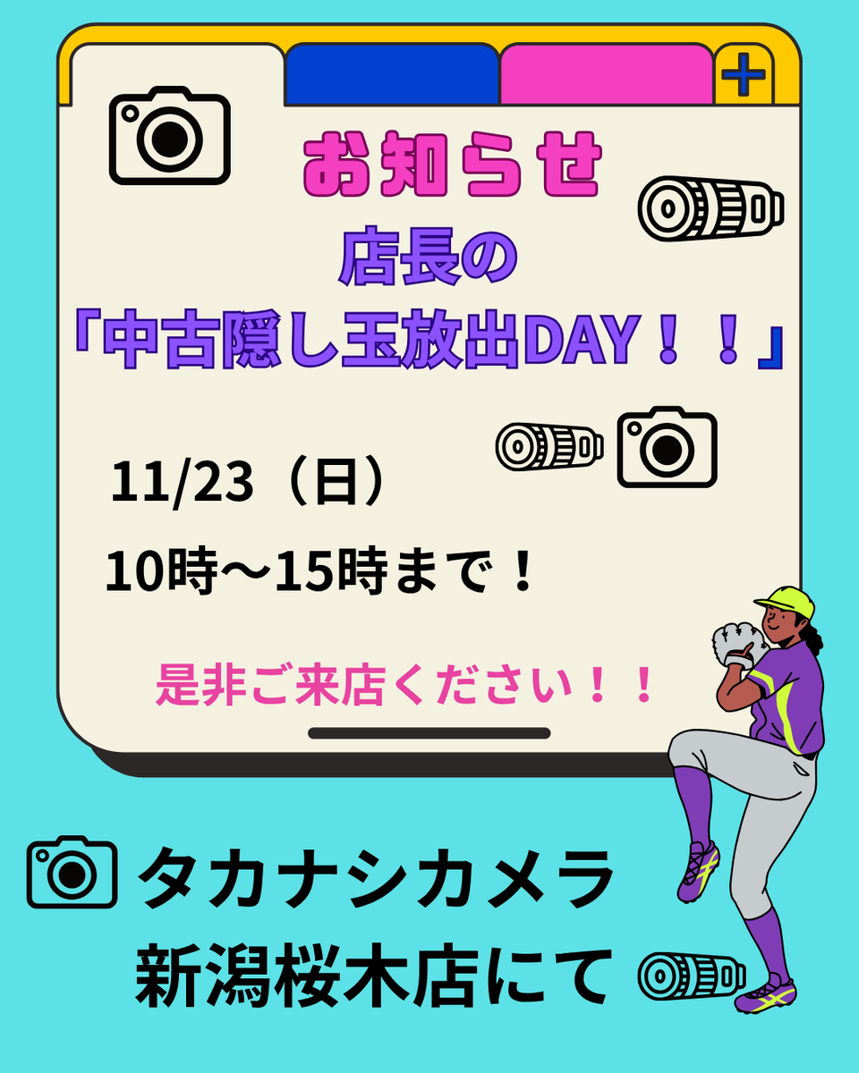 11/23(日)10時から15時に!! タカナシ・カメラ・チェーン 新潟桜木店にて!! 店長の「中古隠し玉放出DAY!!」 を行います! ぜひご来店ください! #カメラ #中古カメラ #カメラ好き集まれ #カメラ部 #新潟 #カメラ屋 #タカナシカメラ #タカナシカメラチェーン #タカナシカメラ新潟桜木店 pic.x.com/UPncGNUpk1