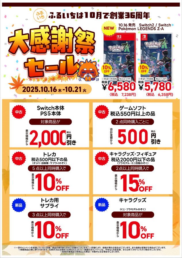 📢大感謝祭セール 1⃣0⃣月1⃣6⃣日(木)~1⃣0⃣月2⃣1⃣日(火)まで❗️ #ふるいち #イオンモール八幡東 #北九州市 #スペースワールド駅 #中古Switch本体 #中古PS5本体 #中古ゲームソフト #中古トレカ #中古キャラグッズ #中古フレンダ #新品トレカサプライ #新品キャラグッズ