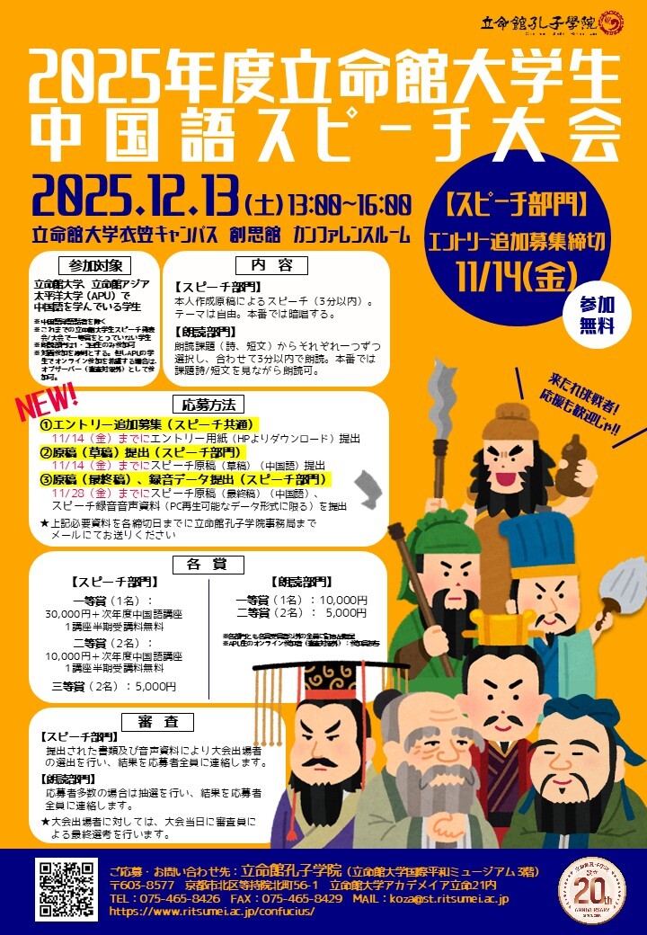 / 【スピーチ部門・エントリー追加募集】 2025年度立命館大学生中国語スピーチ大会 \ 朗読部門は既にエントリー締切となりましたが、スピーチ部門はエントリー追加募集決定! 賞金最高30,000円! 詳細はこちらから↓ ritsumei.ac.jp/confucius/spee… #立命館大学 #中国語 #スピーチ大会 #追加募集 pic.x.com/G74p4OB91v