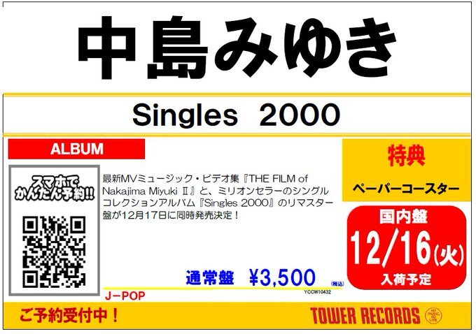 【#中島みゆき】 23年の時を経てついにリマスター化! 「Singles 2000 【リマスター】」 tower.jp/item/7018287 ミュージック・ビデオ集第3弾! 「THE FILM of Nakajima Miyuki II」 tower.jp/item/7018284 ただいまご予約受付中です♪ pic.x.com/RP1LFqOlMH
