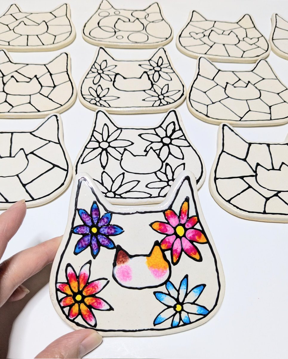お花モチーフのプレートを塗ってみました🐱 ほっぺのピンクとミケ模様がちょっとかぶってしまったけど可愛く塗れたかも😁❤️ 11/24(祝月) 「ギャラリーものがたり」にてワークショップですよ〜!! 来てねー!!! #丸三安田瓦工業 #abecat #ディンプルアート #ギャラリーものがたり #阿賀野市 pic.x.com/pzbE9EjMWK