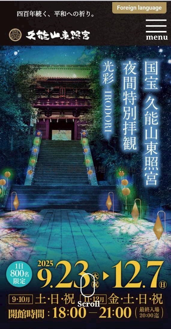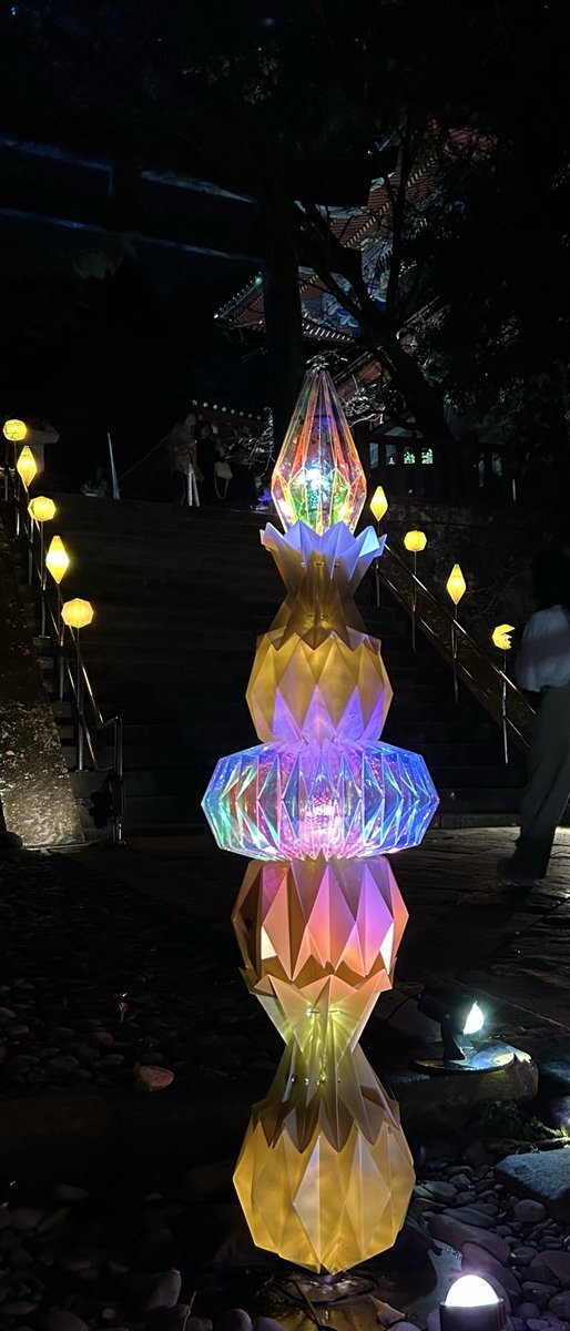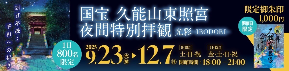 久能山東照宮 夜間特別拝観「光彩-IRODORI-」開催のお知らせ 今年度は"折り紙"をテーマにした幻想的なライトアップを新たに導入し、歴史文化と現代アートが融合した特別な夜をお楽しみいただけます。 開催期間、日時その他、詳しくは公式ホームページをご確認ください。 toshogu-lightup.com