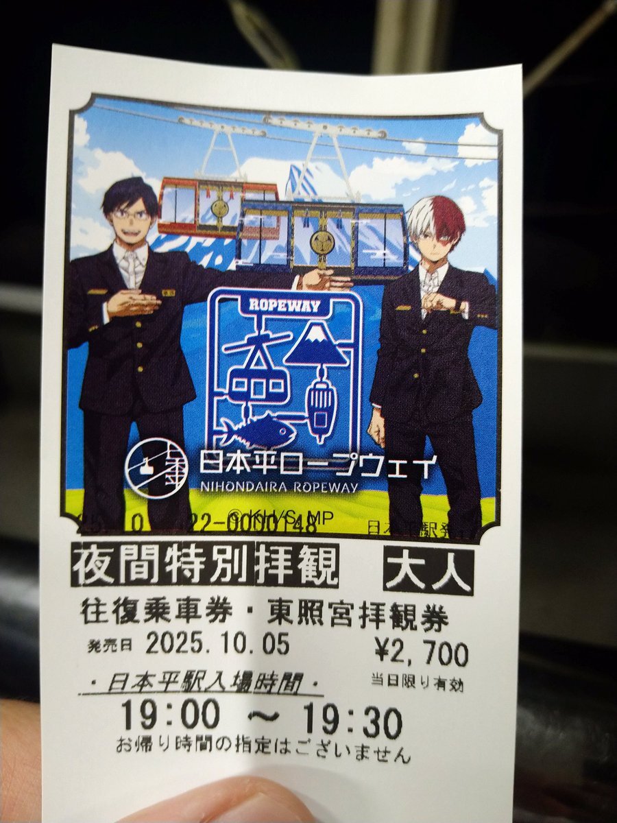 久能山東照宮の夜間特別拝観行ってきたぁ🫶 雨も小雨程度で良い感じ✨ ヒロアカとロープウェイのコラボもあって、かいとさんは大喜び🫶 ライトアップ綺麗だったぁ🎵 #久能山東照宮 #ヒロアカ pic.x.com/VBZJij5RCp