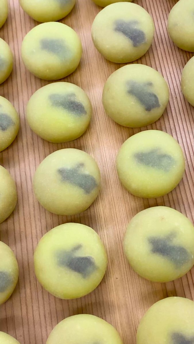 明日は中秋の名月。 こちらは月にうさぎの外良製「名月」を作っている所です。 羊羹を薄く引いて形で抜いたうさぎを栗あんに乗せて黄色に染めた外良で包みます。 外良で包むことによりうさぎさんがほんのりぼやけて良い感じになります。