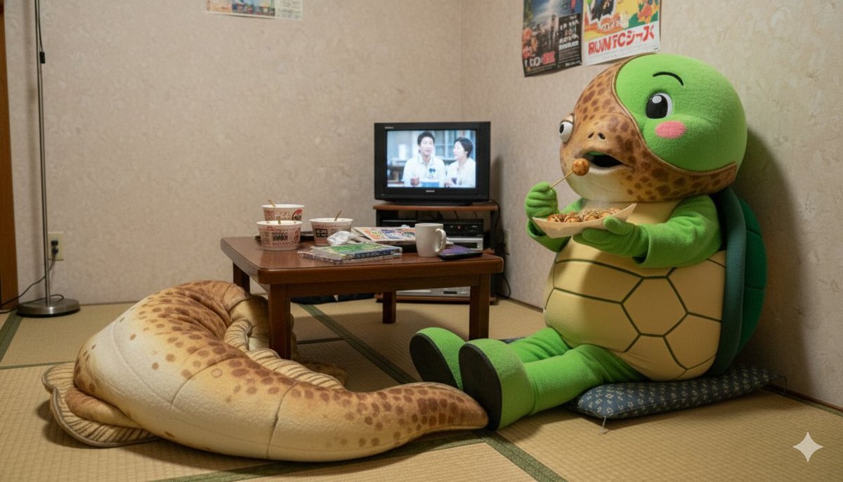 着ぐるみを半分脱いだ状態で、部屋でリラックスしてとお願いしたら、頭の部分だけつけたままでした🤣 どうやらこの覆面(?)は気に入っているらしい😆 #うなぎ #静岡 #亀 pic.x.com/n1i7kstDIE x.com/kamepee_7/stat…