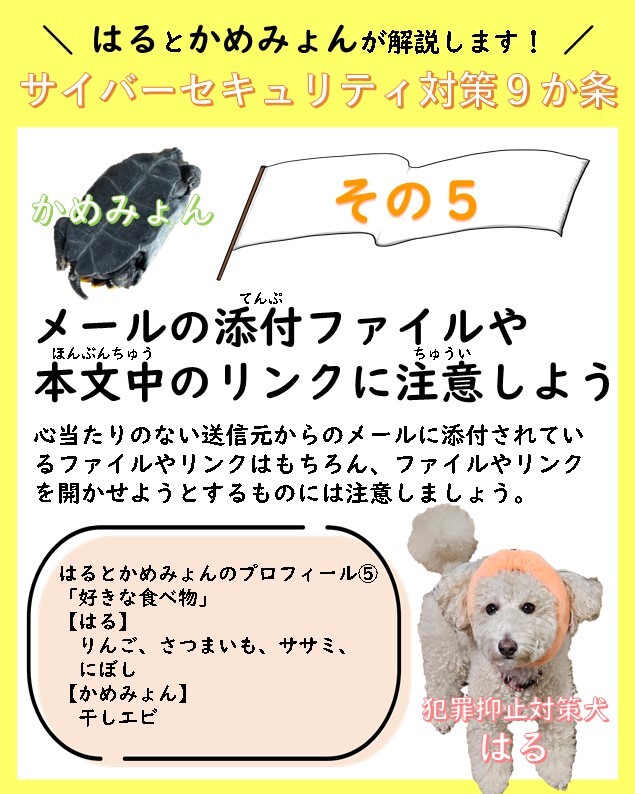 【犯罪抑止対策犬の“はる🐩”とお友達の“かめみょん🐢”が解説😊サイバーセキュリティ対策9か条】 ~その⑤~メールの添付ファイルや本文中のリンクに注意しよう! #三重県警察 #サイバー #サイバーセキュリティ #犯罪抑止対策犬 #犬 #トイプードル #亀 #カメ pic.x.com/7kCWJeZBta